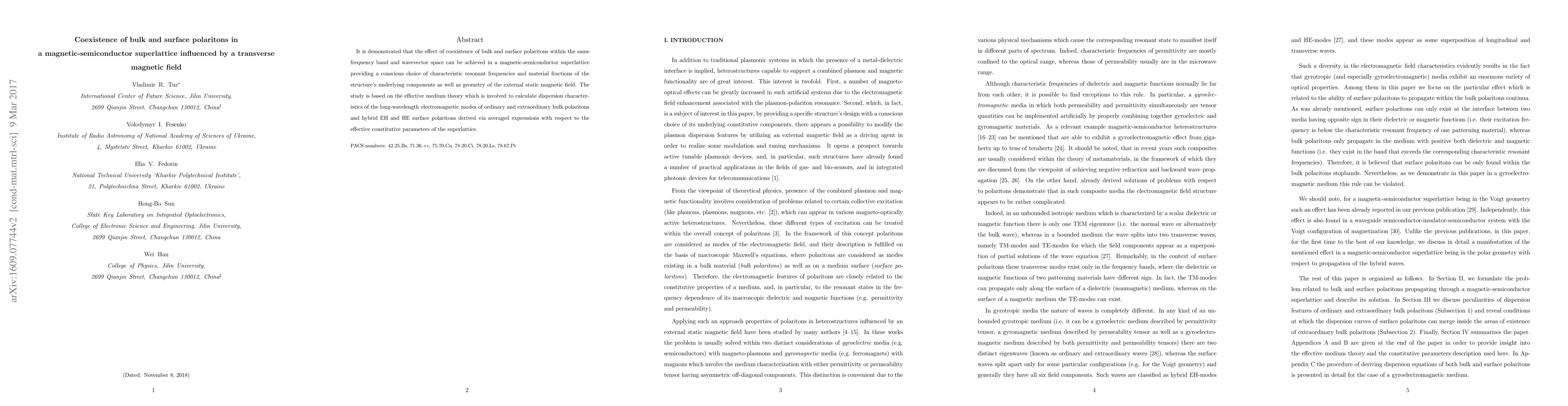 This paper demonstrates the coexistence of bulk and surface polaritons in a magnetic-semiconductor superlattice under the influence of a transverse magnetic field, achieved through careful selection of material properties and magnetic field geometry. The study employs effective medium theory to analyze the dispersion characteristics of these polaritons.