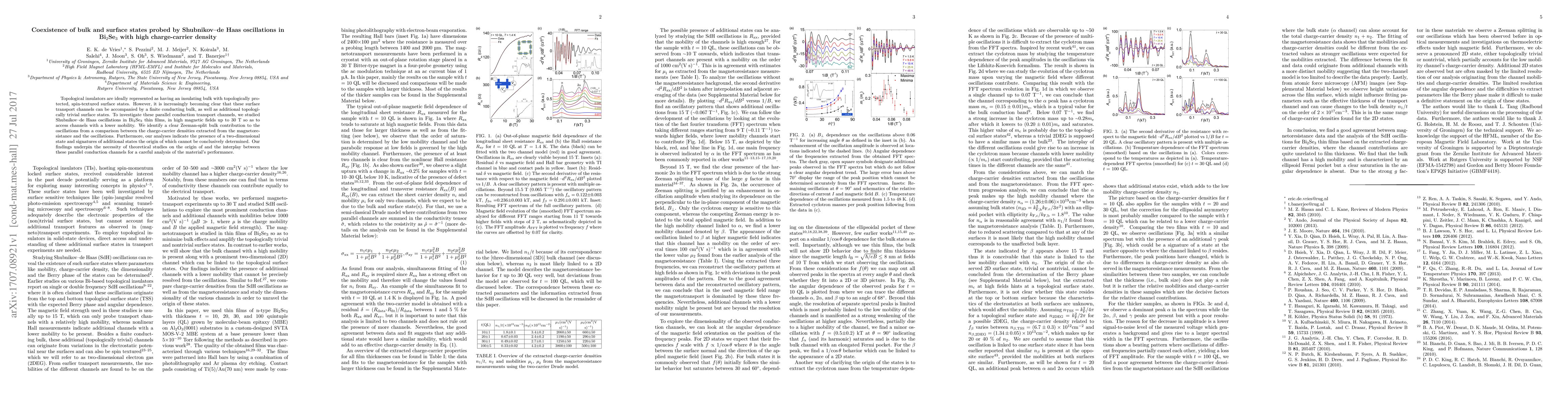 The study investigates Bi2Se3 thin films using Shubnikov-de Haas oscillations in high magnetic fields, identifying a Zeeman-split bulk contribution to oscillations and evidence of two-dimensional states and additional undetermined surface states. This suggests the need for theoretical exploration of parallel conduction channels in topological insulators.