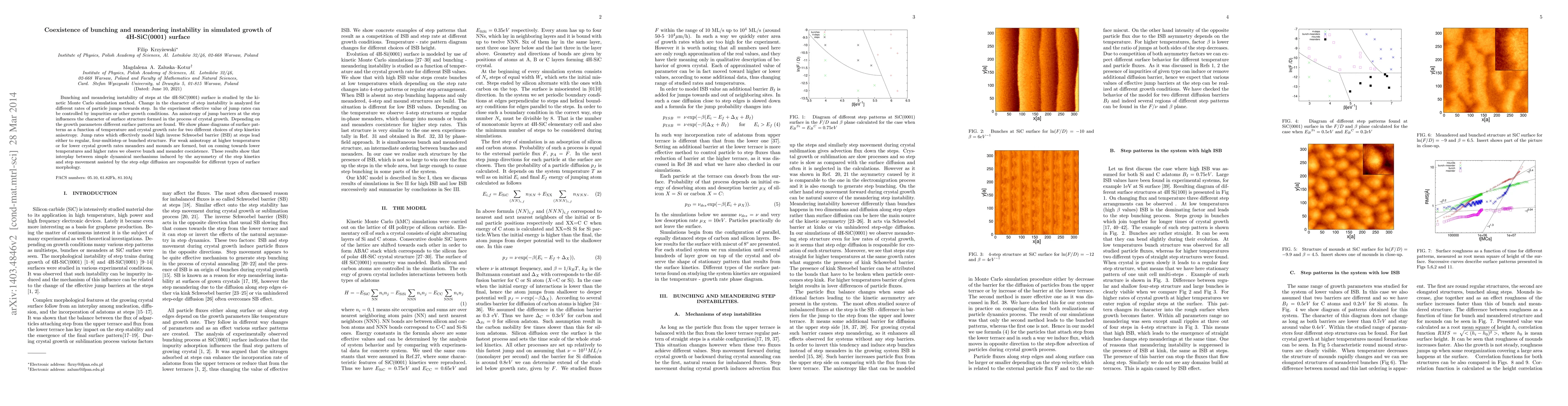 This study uses kinetic Monte Carlo simulation to explore the step instabilities (bunching and meandering) in 4H-SiC(0001) surface growth. The research reveals that the interplay between step kinetics asymmetry and step edge diffusion results in diverse surface patterns, influenced by growth parameters like temperature and rate. Phase diagrams illustrate that varying these parameters can lead to the coexistence of bunched and meandering structures, highlighting the importance of step dynamics in controlling surface morphology during crystal growth.