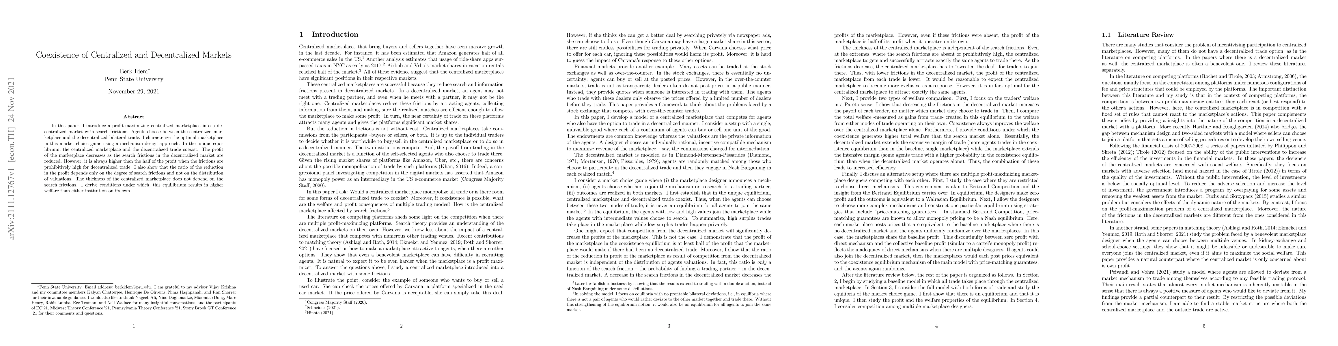 This paper explores the coexistence of centralized and decentralized markets, demonstrating that both can optimally coexist in equilibrium. The profit of the centralized marketplace is higher than half its maximum potential, even as search frictions in the decentralized market decrease.