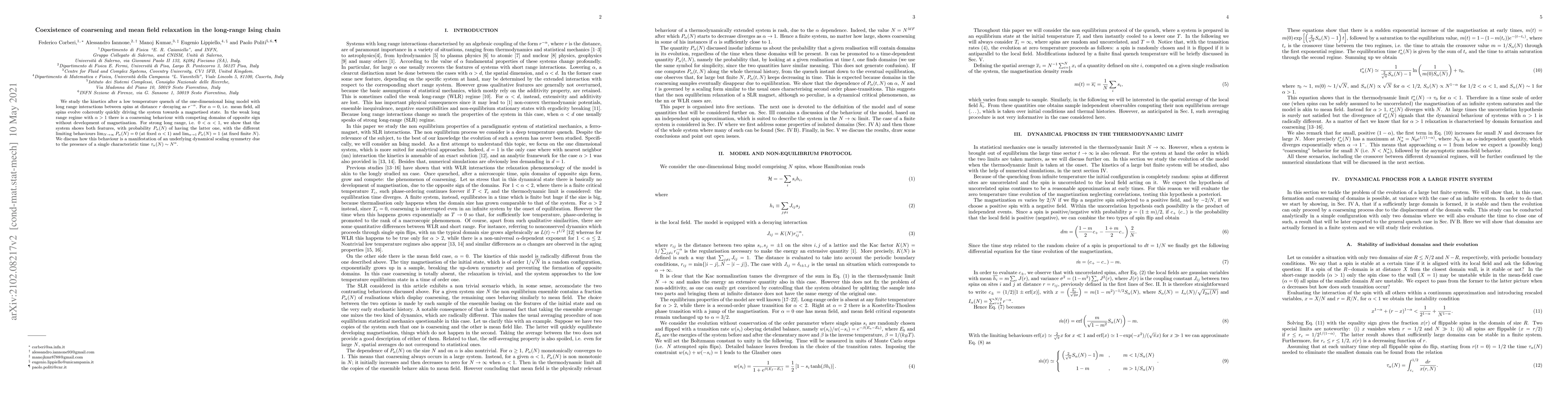 The paper studies the kinetics of a one-dimensional Ising model with long-range interactions, showing that it exhibits coarsening and mean field relaxation behaviors depending on the strength of the interactions. The system's behavior is influenced by an underlying dynamical scaling symmetry.