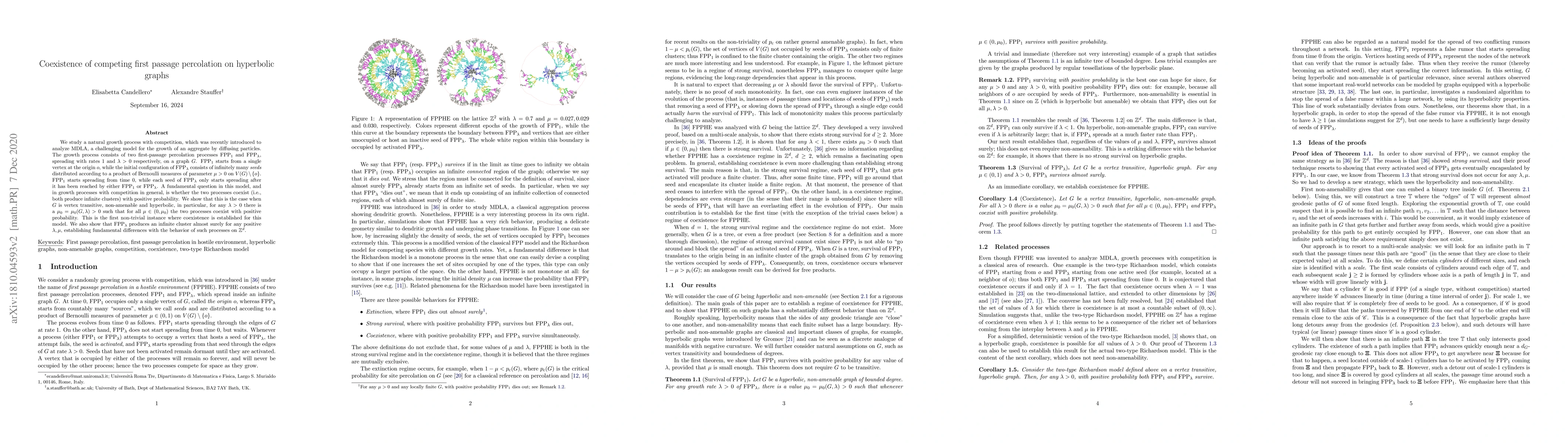 Researchers show that competing first-passage percolation processes on hyperbolic graphs can coexist with positive probability for specific conditions, establishing a fundamental difference in their behavior.