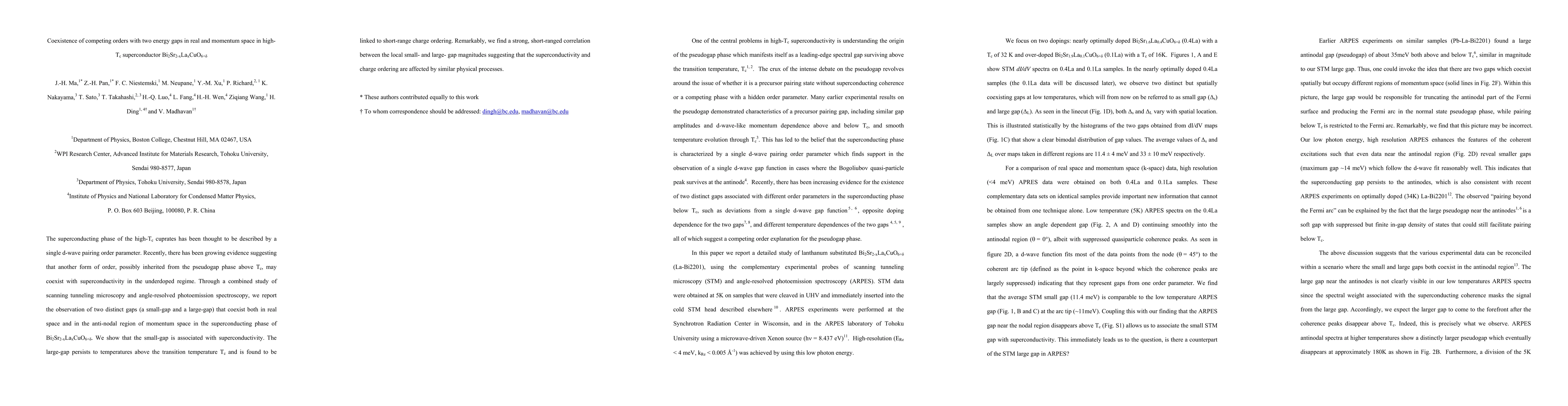 This study reveals the coexistence of two distinct energy gaps in the superconducting phase of Bi2Sr2-xLaxCuO6+delta, with the small-gap linked to superconductivity and the large-gap associated with charge ordering, suggesting intertwined physical processes.