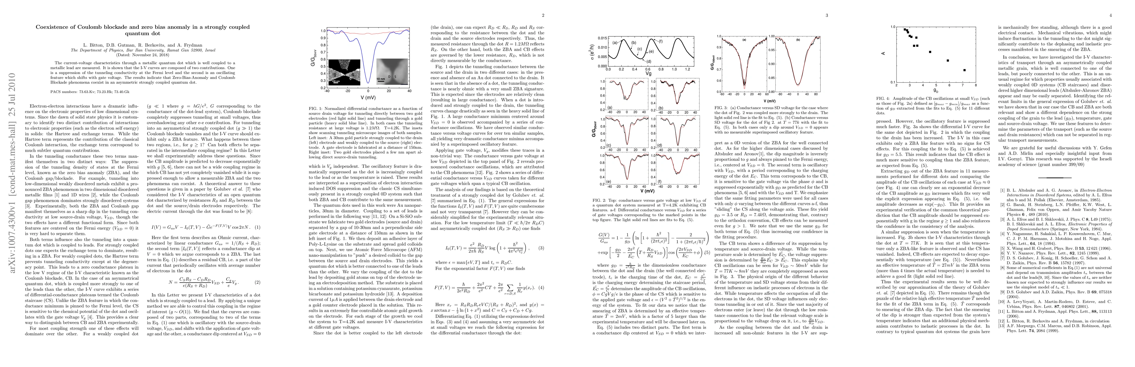 Summary: The study reveals that a strongly coupled quantum dot exhibits both Coulomb blockade and zero-bias anomaly in its current-voltage characteristics, with the I-V curves showing suppressed tunneling conductivity and oscillating features that shift with gate voltage.