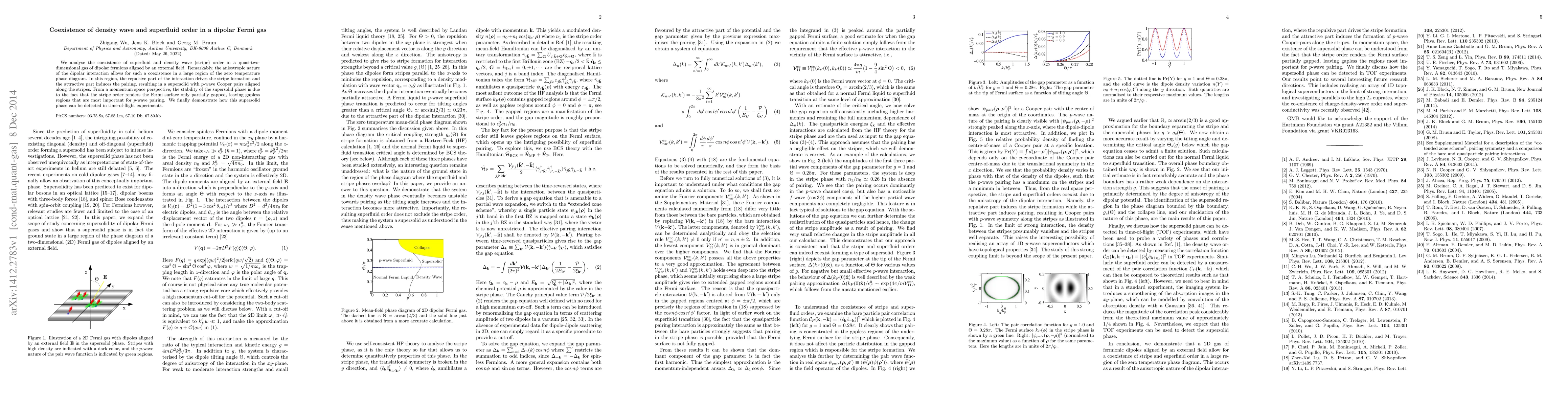 The novelty lies in the demonstration of a supersolid phase in a dipolar Fermi gas, where stripe formation and p-wave Cooper pairing coexist, and the proposal of detecting this phase via time-of-flight experiments.