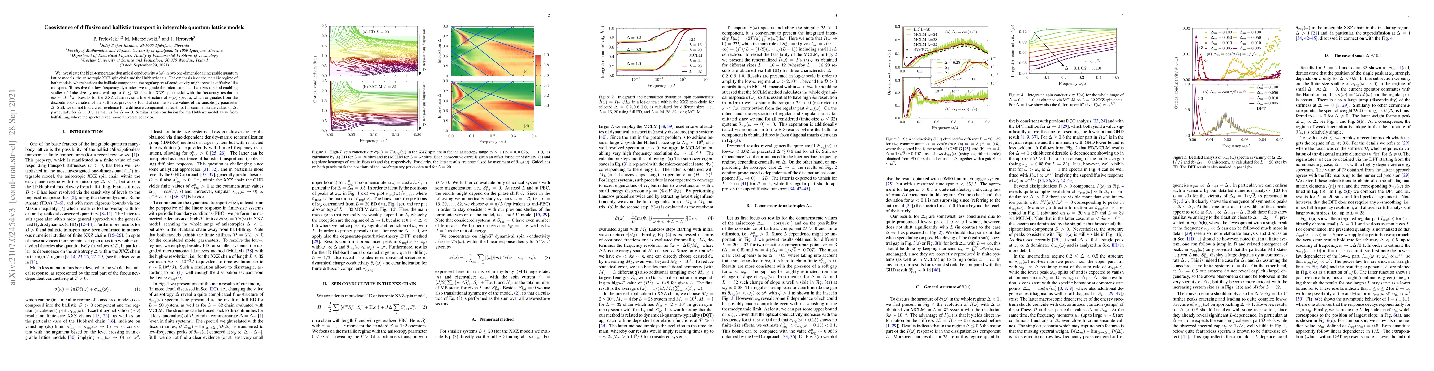 This research examines the high-temperature dynamical conductivity in two one-dimensional integrable quantum lattice models, focusing on the coexistence of diffusive and ballistic transport. While ballistic components are evident, no clear diffusive transport is found in the studied regimes, particularly in the XXZ spin chain and Hubbard model.