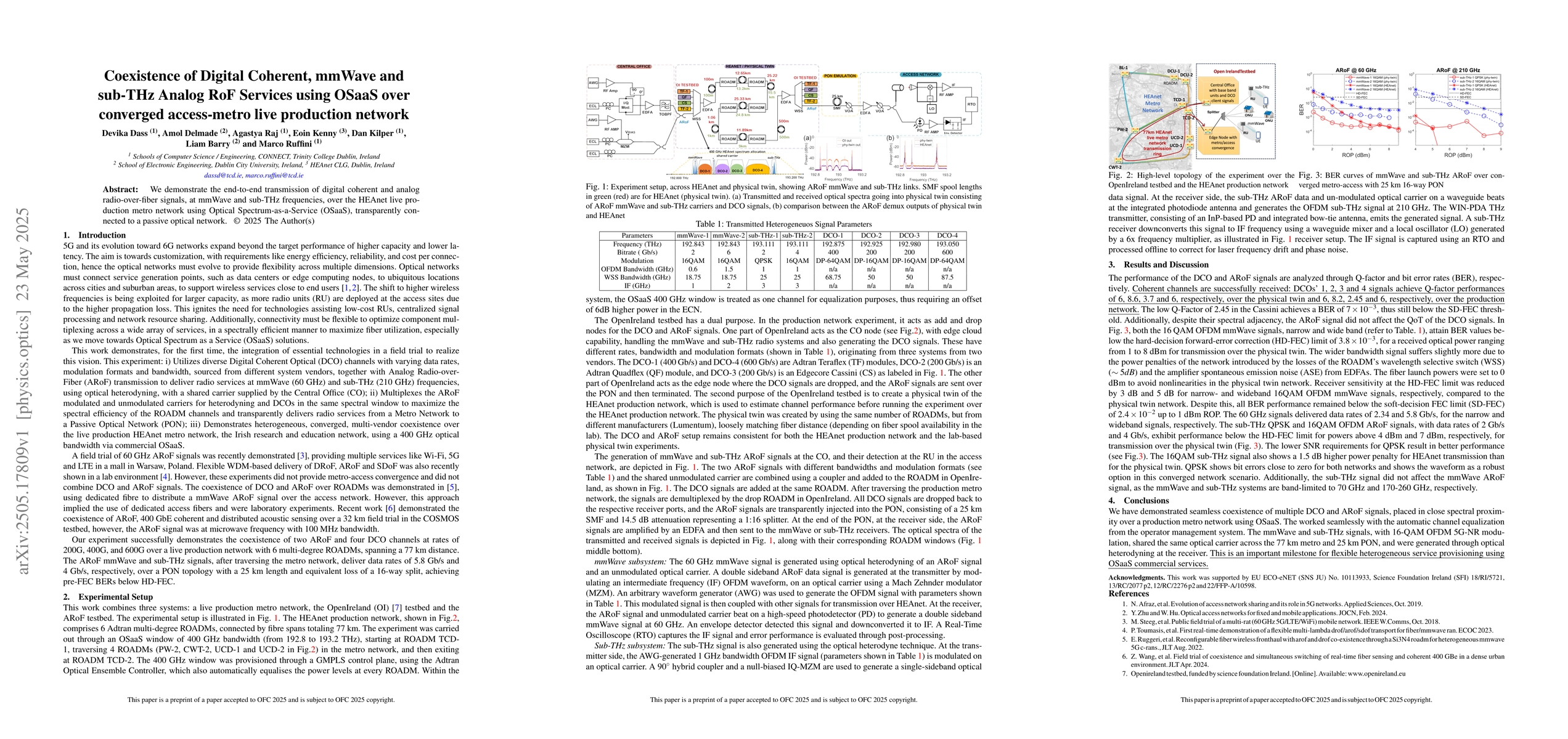 The research demonstrates end-to-end transmission of digital coherent and analog RoF signals at mmWave and sub-THz frequencies over HEAnet's live production metro network using Optical Spectrum-as-a-Service (OSaaS), transparently connected to a passive optical network.