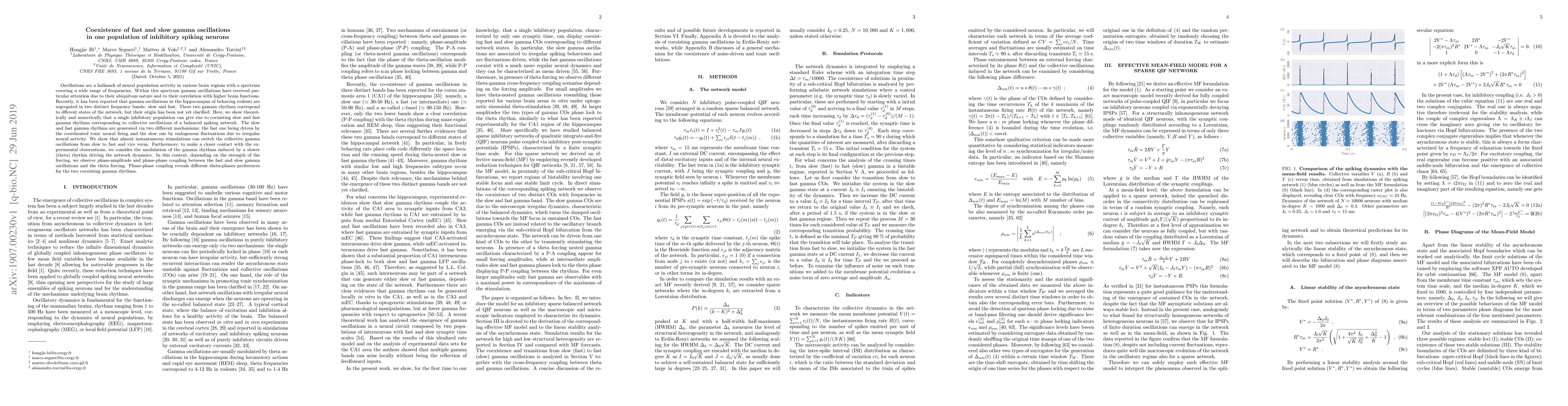 Oscillations are a hallmark of neural population activity in various brain regions with a spectrum covering a wide range of frequencies. Within this spectrum gamma oscillations have received particular attention due to their ubiquitous nature and to their correlation with higher brain functions. Recently, it has been reported that gamma oscillations in the hippocampus of behaving rodents are segregated in two distinct frequency bands: slow and fast. These two gamma rhythms correspond to dfferent states of the network, but their origin has been not yet clarified. Here, we show theoretically and numerically that a single inhibitory population can give rise to coexisting slow and fast gamma rhythms corresponding to collective oscillations of a balanced spiking network. The slow and fast gamma rhythms are generated via two different mechanisms: the fast one being driven by the coordinated tonic neural firing and the slow one by endogenous fluctuations due to irregular neural activity. We show that almost instantaneous stimulations can switch the collective gamma oscillations from slow to fast and vice versa. Furthermore, to make a closer contact with the experimental observations, we consider the modulation of the gamma rhythms induced by a slower (theta) rhythm driving the network dynamics. In this context, depending on the strength of the forcing, we observe phase-amplitude and phase-phase coupling between the fast and slow gamma oscillations and the theta forcing. Phase-phase coupling reveals different theta-phases preferences for the two coexisting gamma rhythms.