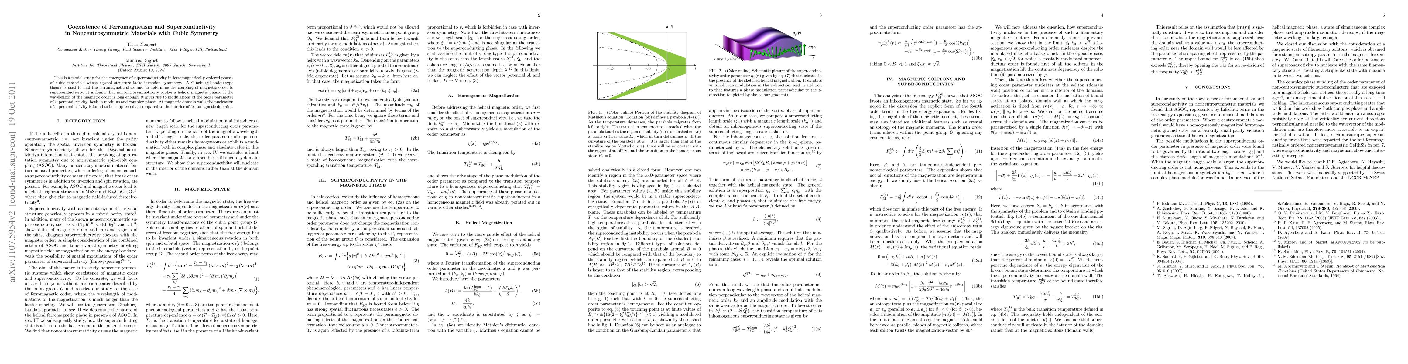This research uses a Ginzburg-Landau-type theory to explore the coexistence of ferromagnetism and superconductivity in cubic materials without inversion symmetry. It finds that noncentrosymmetricity can induce a helical magnetic phase, causing superconductivity modulations at magnetic domain walls, where superconductivity nucleation is suppressed.