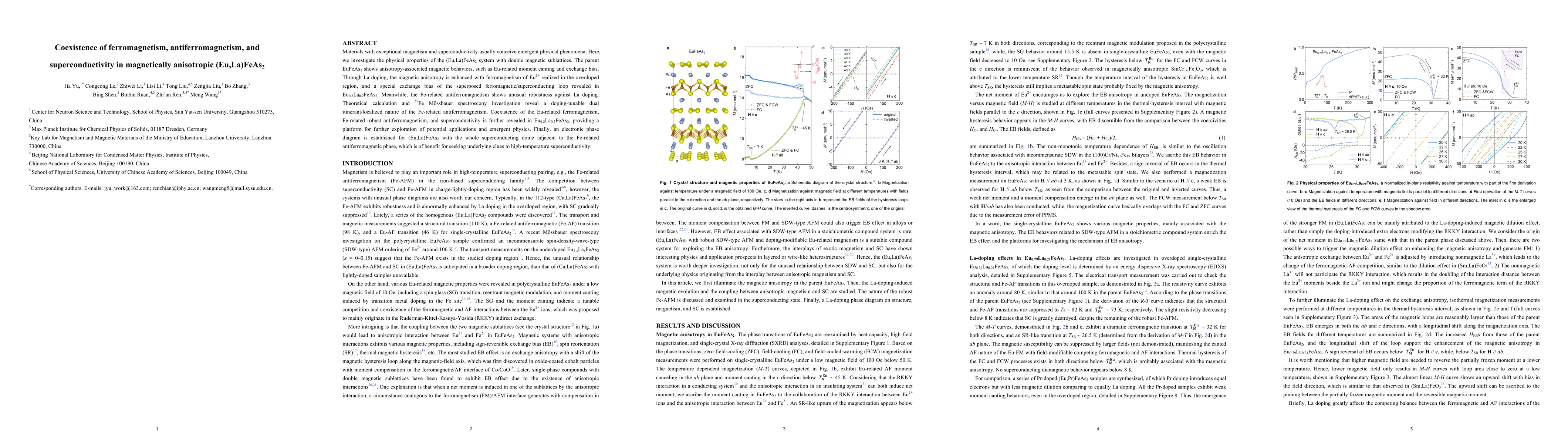 This study investigates the coexistence of ferromagnetism, antiferromagnetism, and superconductivity in magnetically anisotropic (Eu,La)FeAs2, revealing complex magnetic behaviors and a robust Fe-related antiferromagnetism. The research highlights the potential for emergent phenomena and applications in the material.
