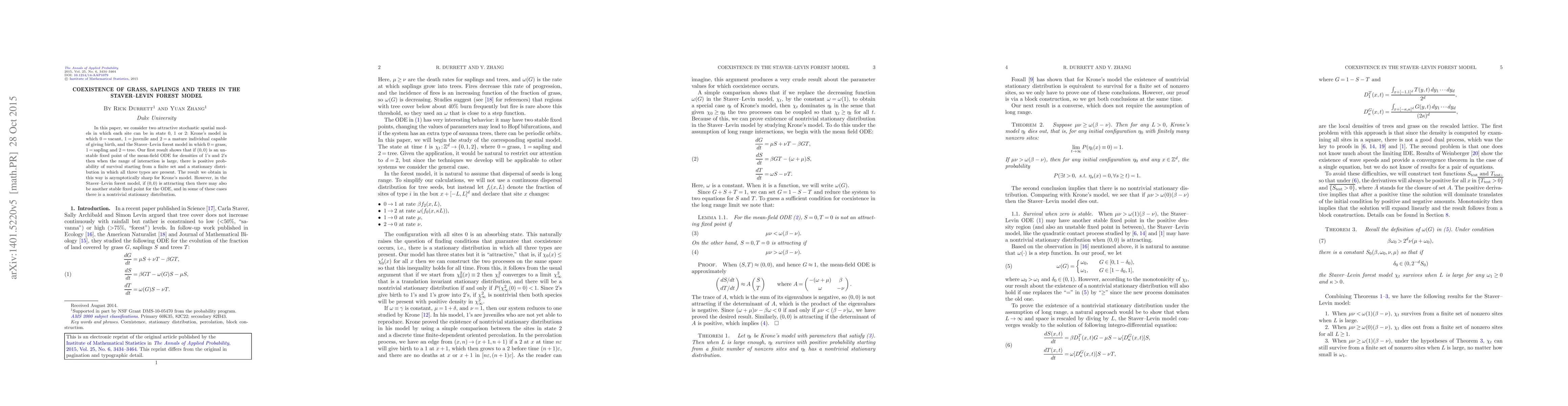 In this paper, we consider two attractive stochastic spatial models in which each site can be in state 0, 1 or 2: Krone's model in which 0${}={}$vacant, 1${}={}$juvenile and 2${}={}$a mature individual capable of giving birth, and the Staver-Levin forest model in which 0${}={}$grass, 1${}={}$sapling and 2${}={}$tree. Our first result shows that if $(0,0)$ is an unstable fixed point of the mean-field ODE for densities of 1's and 2's then when the range of interaction is large, there is positive probability of survival starting from a finite set and a stationary distribution in which all three types are present. The result we obtain in this way is asymptotically sharp for Krone's model. However, in the Staver-Levin forest model, if $(0,0)$ is attracting then there may also be another stable fixed point for the ODE, and in some of these cases there is a nontrivial stationary distribution.