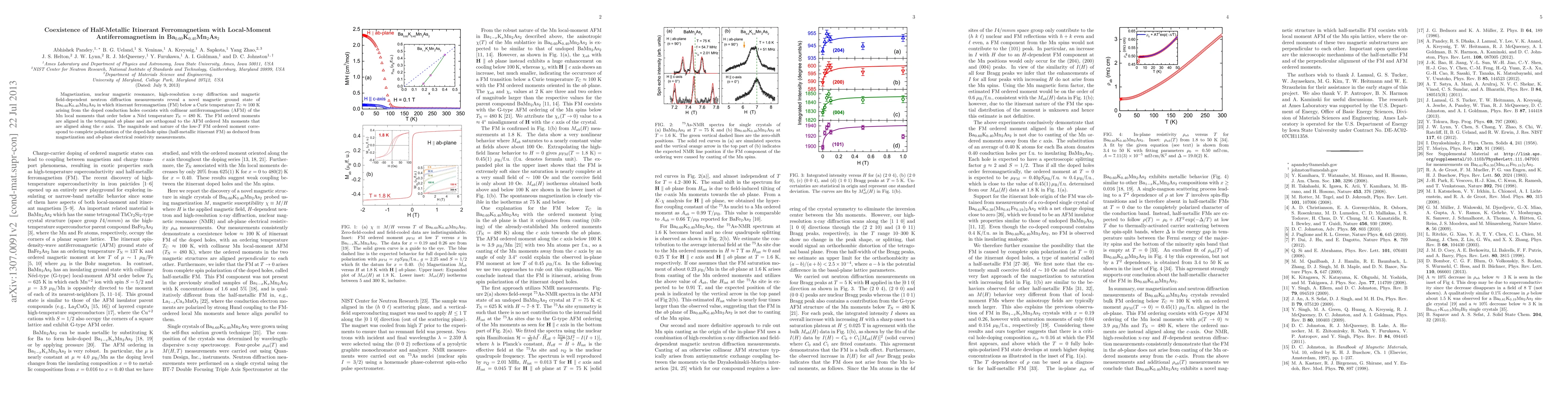 Magnetization, nuclear magnetic resonance, high-resolution x-ray diffraction and magnetic field-dependent neutron diffraction measurements reveal a novel magnetic ground state of Ba{0.60}K{0.40}Mn2As2 in which itinerant ferromagnetism (FM) below a Curie temperature TC = 100 K arising from the doped conduction holes coexists with collinear antiferromagnetism (AFM) of the Mn local moments that order below a Neel temperature TN = 480 K. The FM ordered moments are aligned in the tetragonal ab-plane and are orthogonal to the AFM-ordered Mn moments that are aligned along the c-axis. The magnitude and nature of the low-T FM ordered moment correspond to complete polarization of the doped-hole spins (half-metallic itinerant FM) as deduced from magnetization and ab-plane electrical resistivity measurements.