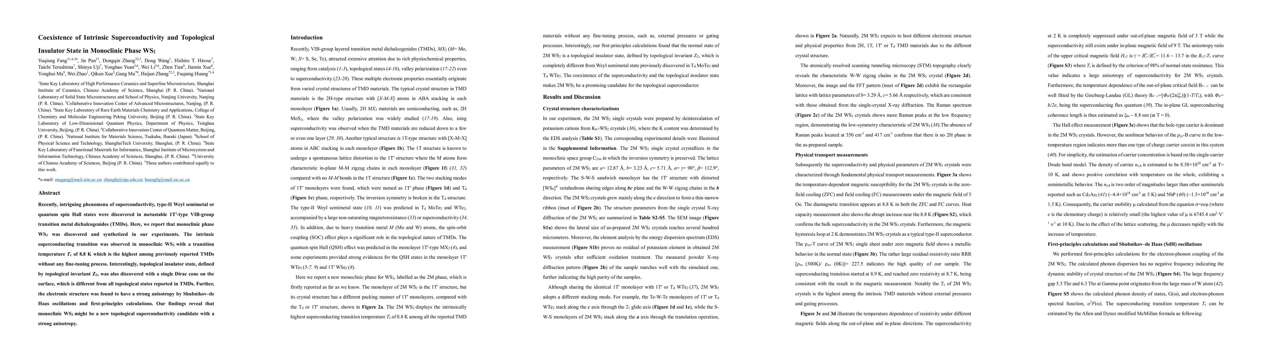 This paper reports the discovery of monoclinic phase WS2 exhibiting intrinsic superconductivity with a transition temperature of 8.8 K, the highest among transition metal dichalcogenides, alongside a novel topological insulator state characterized by a single Dirac cone. The findings suggest monoclinic WS2 could be a new candidate for topological superconductivity with significant electronic anisotropy.