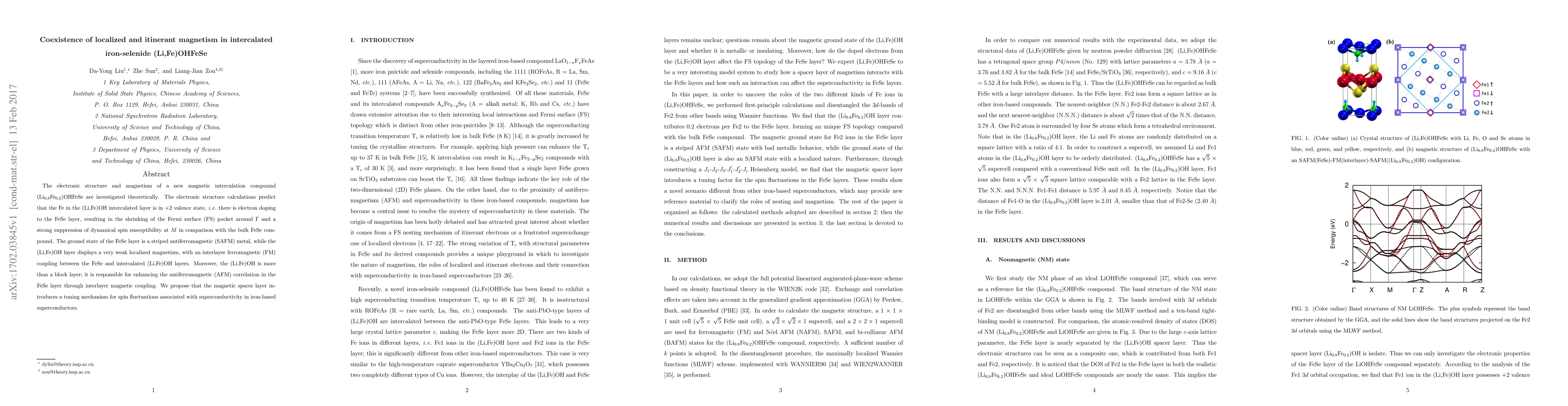 This research investigates the electronic structure and magnetism of the compound (Li0.8Fe0.2)OHFeSe, revealing a coexistence of weak localized magnetism in the intercalated layer and itinerant antiferromagnetism in the FeSe layer, with a notable interlayer ferromagnetic coupling. The study proposes a tuning mechanism for spin fluctuations potentially influencing superconductivity.