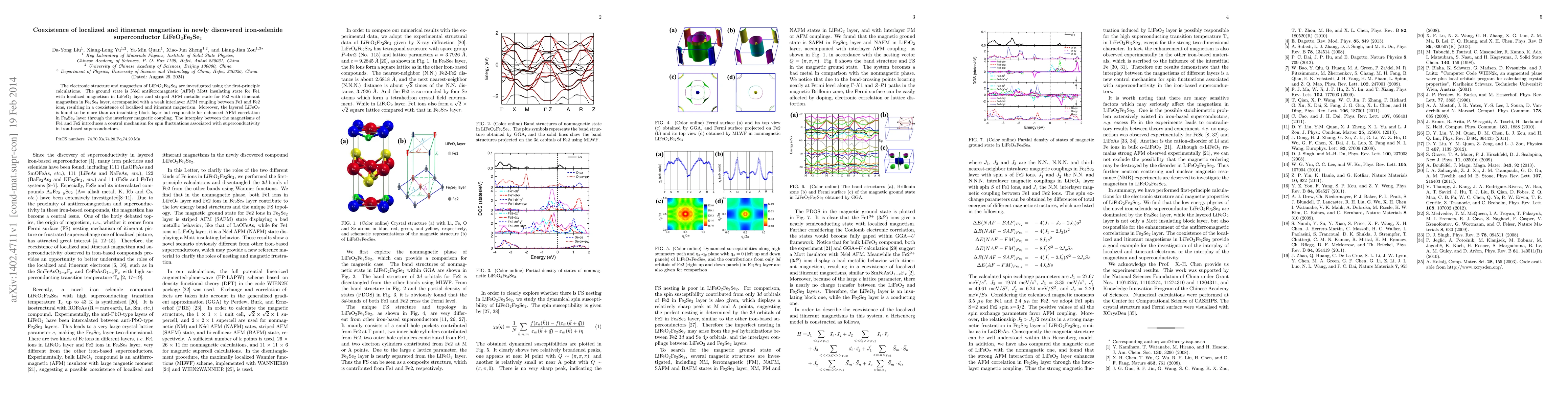 This research reveals that LiFeO$_{2}$Fe$_{2}$Se$_{2}$ exhibits both localized magnetism in the LiFeO$_{2}$ layer and itinerant magnetism in the Fe$_{2}$Se$_{2}$ layer, leading to a unique coexistence of these magnetic states. The study also highlights the role of interlayer magnetic coupling in enhancing antiferromagnetic correlations and influencing superconductivity.