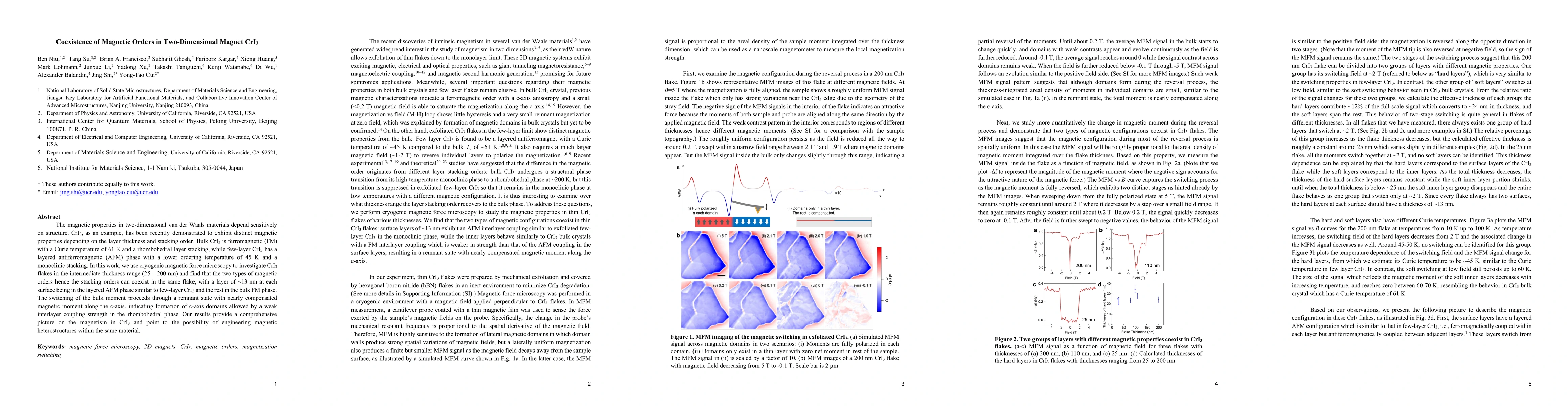 The magnetic properties in two-dimensional van der Waals materials depend sensitively on structure. CrI3, as an example, has been recently demonstrated to exhibit distinct magnetic properties depending on the layer thickness and stacking order. Bulk CrI3 is ferromagnetic (FM) with a Curie temperature of 61 K and a rhombohedral layer stacking, while few-layer CrI3 has a layered antiferromagnetic (AFM) phase with a lower ordering temperature of 45 K and a monoclinic stacking. In this work, we use cryogenic magnetic force microscopy to investigate CrI3 flakes in the intermediate thickness range (25 - 200 nm) and find that the two types of magnetic orders hence the stacking orders can coexist in the same flake, with a layer of ~13 nm at each surface being in the layered AFM phase similar to few-layer CrI3 and the rest in the bulk FM phase. The switching of the bulk moment proceeds through a remnant state with nearly compensated magnetic moment along the c-axis, indicating formation of c-axis domains allowed by a weak interlayer coupling strength in the rhombohedral phase. Our results provide a comprehensive picture on the magnetism in CrI3 and point to the possibility of engineering magnetic heterostructures within the same material.