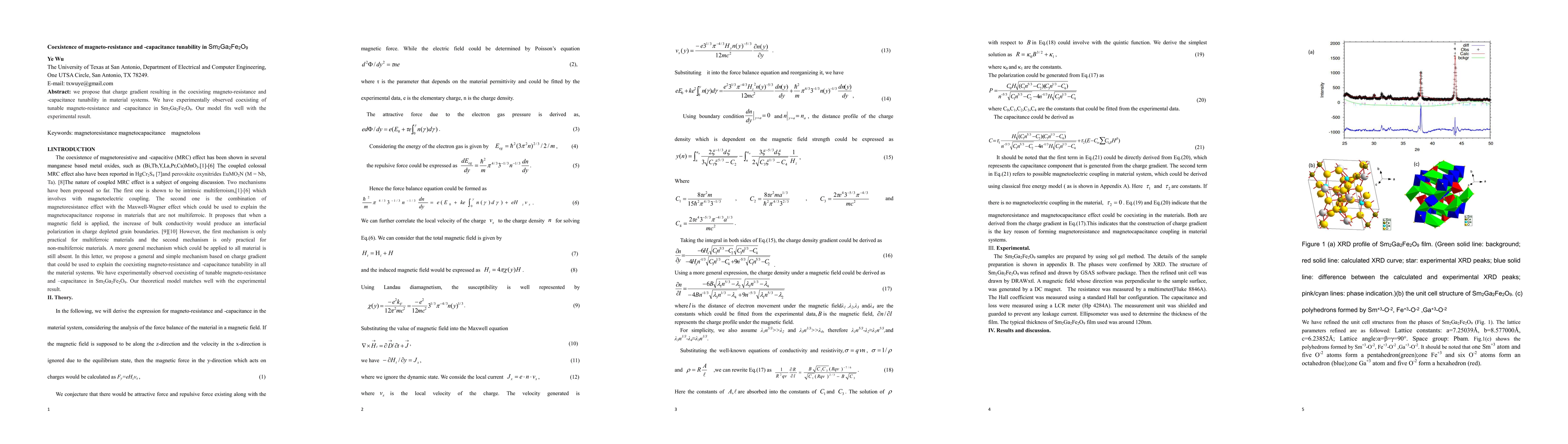 We propose that charge gradient resulting in the coexisting magneto-resistance and-capacitance tunability in material systems. We have experimentally observed coexisting of tunable magneto-resistance and -capacitance in Sm2Ga2Fe2O9. Our model fits well with the experimental result.