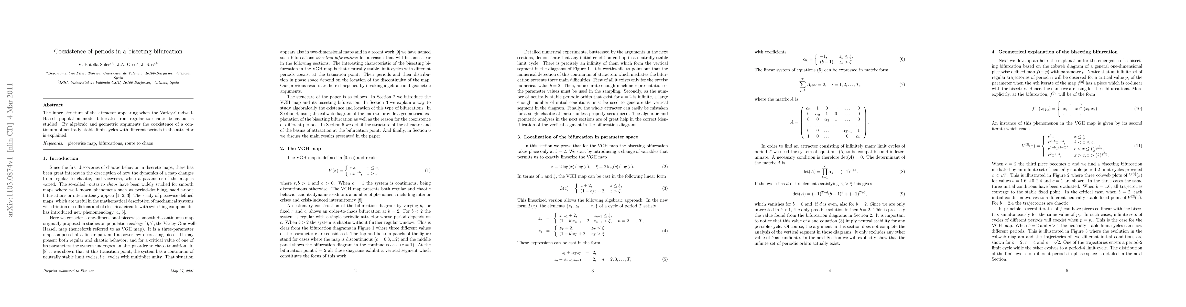 The inner structure of the attractor appearing when the Varley-Gradwell-Hassell population model bifurcates from regular to chaotic behaviour is studied. By algebraic and geometric arguments the coexistence of a continuum of neutrally stable limit cycles with different periods in the attractor is explained.