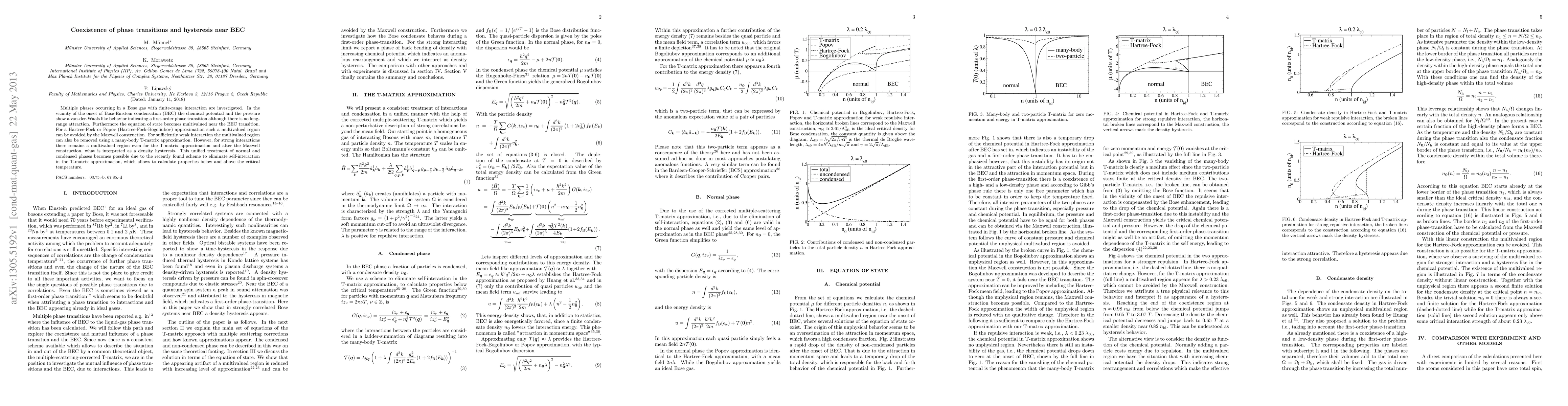 Multiple phases occurring in a Bose gas with finite-range interaction are investigated. In the vicinity of the onset of Bose-Einstein condensation (BEC) the chemical potential and the pressure show a van-der-Waals like behavior indicating a first-order phase transition although there is no long-range attraction. Furthermore the equation of state becomes multivalued near the BEC transition. For a Hartree-Fock or Popov (Hartree-Fock-Bogoliubov) approximation such a multivalued region can be avoided by the Maxwell construction. For sufficiently weak interaction the multivalued region can also be removed using a many-body \mbox{T-matrix} approximation. However, for strong interactions there remains a multivalued region even for the \mbox{T-matrix} approximation and after the Maxwell construction, what is interpreted as a density hysteresis. This unified treatment of normal and condensed phases becomes possible due to the recently found scheme to eliminate self-interaction in the \mbox{T-matrix} approximation, which allows to calculate properties below and above the critical temperature.