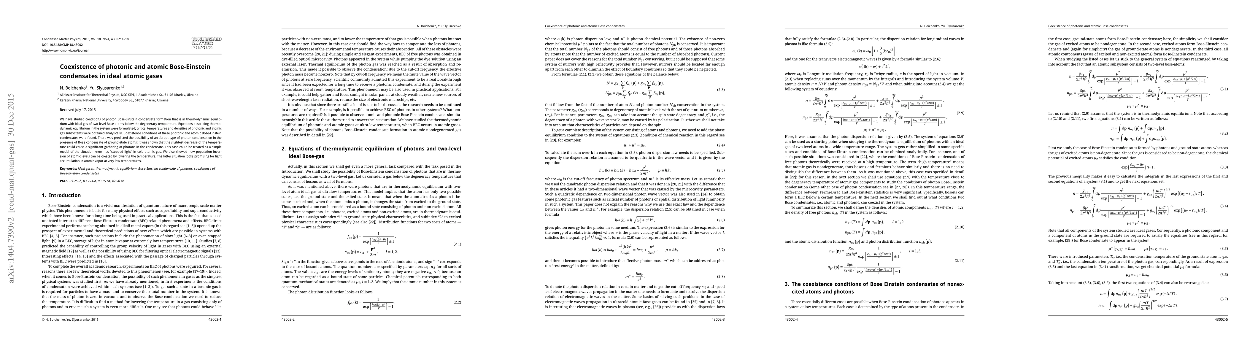 This paper investigates the thermodynamic equilibrium conditions for the coexistence of photonic and atomic Bose-Einstein condensates in ideal atomic gases, deriving critical temperatures and densities analytically. It predicts a significant photon condensation in the presence of a ground-state atomic Bose condensate, potentially modeling "stopped light" and suggesting a promising method for light accumulation in cold atomic vapors.