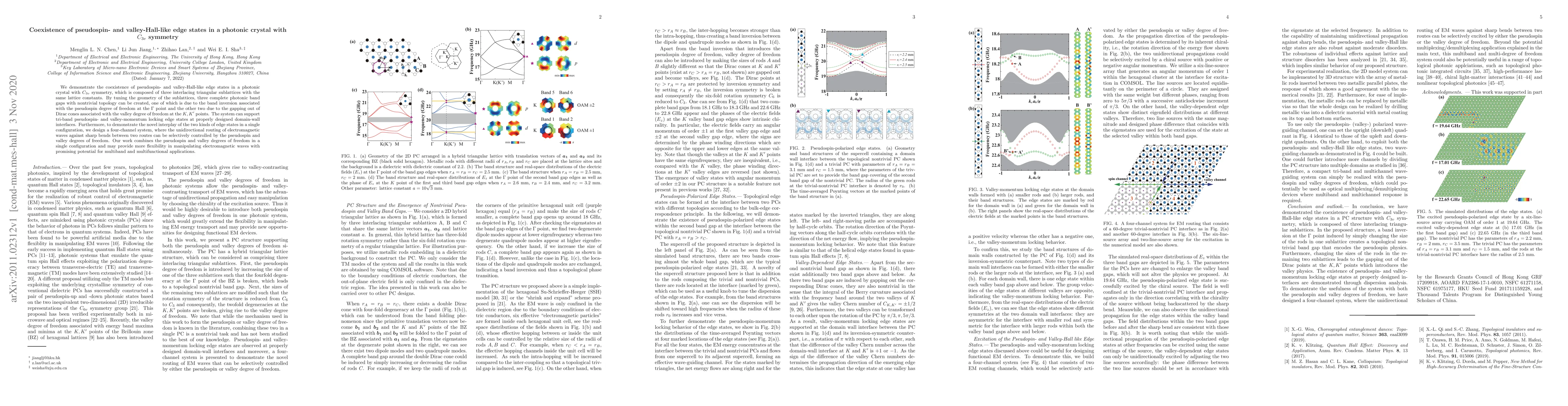 This research demonstrates the coexistence of pseudospin- and valley-Hall-like edge states in a photonic crystal with $C_{3v}$ symmetry, showcasing the potential for tri-band edge states and directional control of electromagnetic waves through pseudospin and valley degrees of freedom. The study highlights a four-channel system capable of selective unidirectional routing, indicating promising applications for multifunctional wave manipulation.