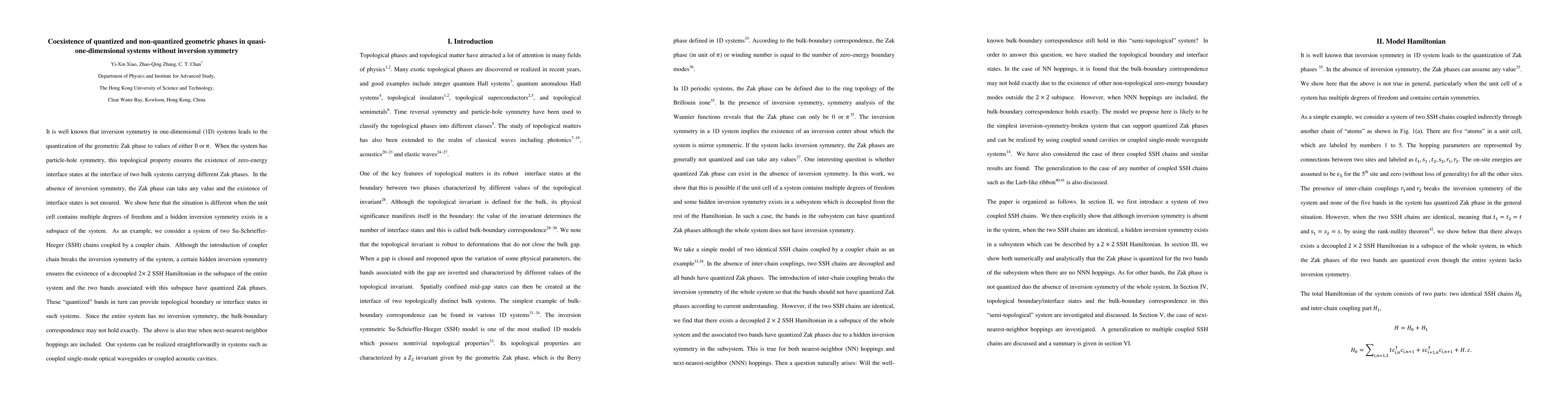 This paper investigates the coexistence of quantized and non-quantized geometric phases in quasi-one-dimensional systems lacking inversion symmetry. It demonstrates that hidden inversion symmetry within a subspace can lead to quantized Zak phases and topological boundary states, even when the entire system lacks inversion symmetry.