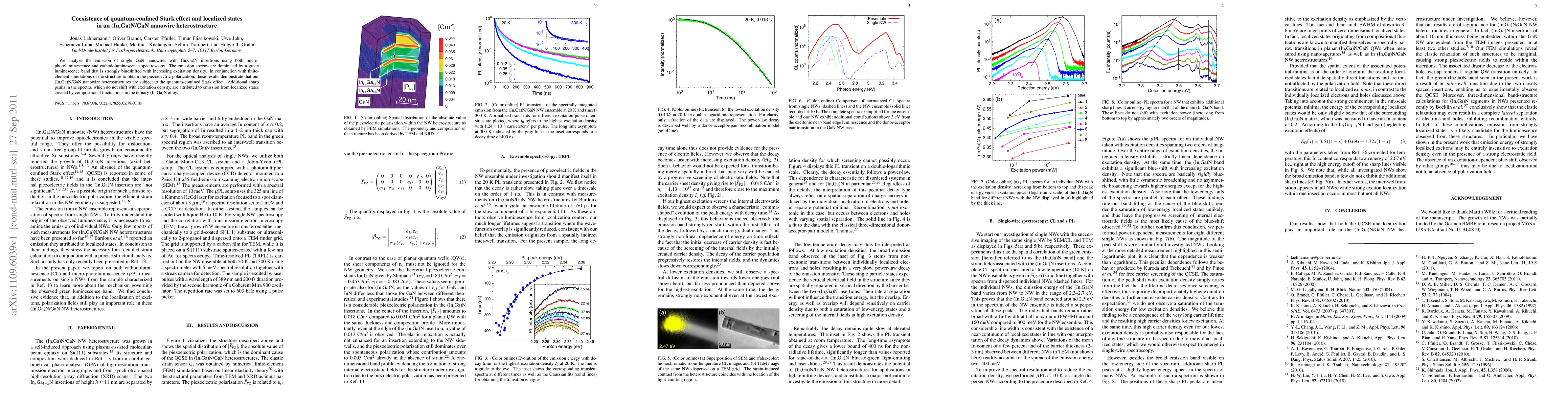 We analyze the emission of single GaN nanowires with (In,Ga)N insertions using both micro-photoluminescence and cathodoluminescence spectroscopy. The emission spectra are dominated by a green luminescence band that is strongly blueshifted with increasing excitation density. In conjunction with finite-element simulations of the structure to obtain the piezoelectric polarization, these results demonstrate that our (In,Ga)N/GaN nanowire heterostructures are subject to the quantum-confined Stark effect. Additional sharp peaks in the spectra, which do not shift with excitation density, are attributed to emission from localized states created by compositional fluctuations in the ternary (In,Ga)N alloy.