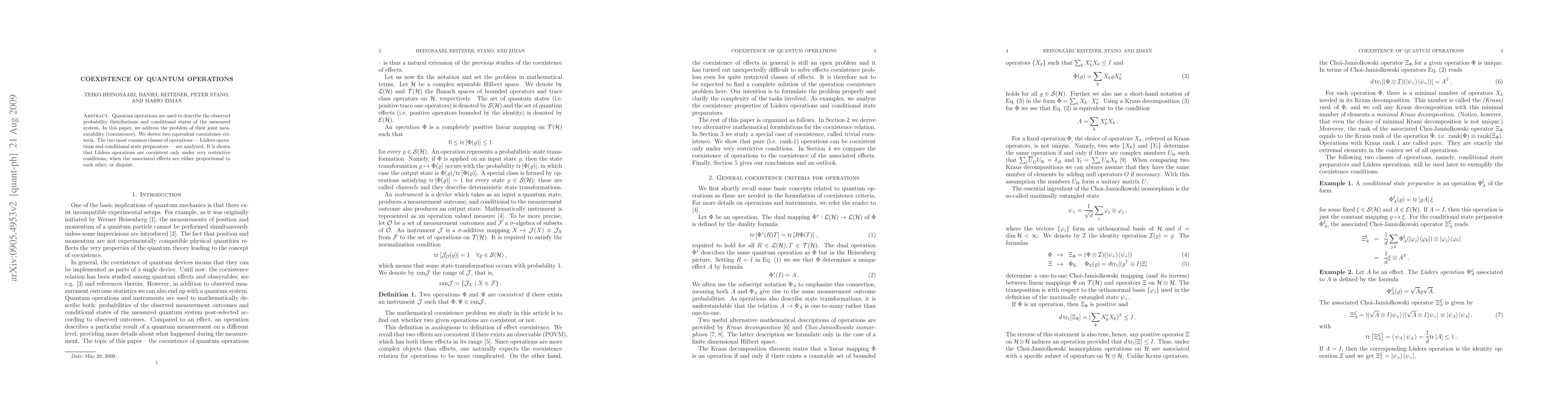 Quantum operations are used to describe the observed probability distributions and conditional states of the measured system. In this paper, we address the problem of their joint measurability (coexistence). We derive two equivalent coexistence criteria. The two most common classes of operations - Luders operations and conditional state preparators - are analyzed. It is shown that Luders operations are coexistent only under very restrictive conditions, when the associated effects are either proportional to each other, or disjoint.