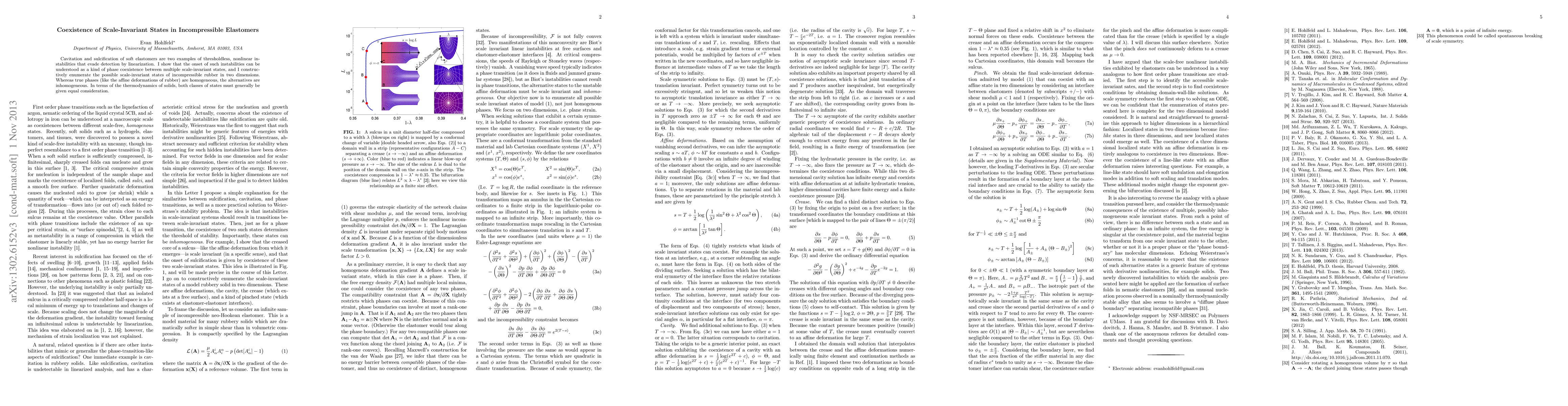 Cavitation and sulcification of soft elastomers are two examples of thresholdless, nonlinear instabilities that evade detection by linearization. I show that the onset of such instabilities can be understood as a kind of phase coexistence between multiple scale-invariant states, and I constructively enumerate the possible scale-invariant states of incompressible rubber in two dimensions. Whereas true phases (like the affine deformations of rubber) are homogeneous, the alternatives are inhomogeneous. In terms of the thermodynamics of solids, both classes of states must generally be given equal consideration.