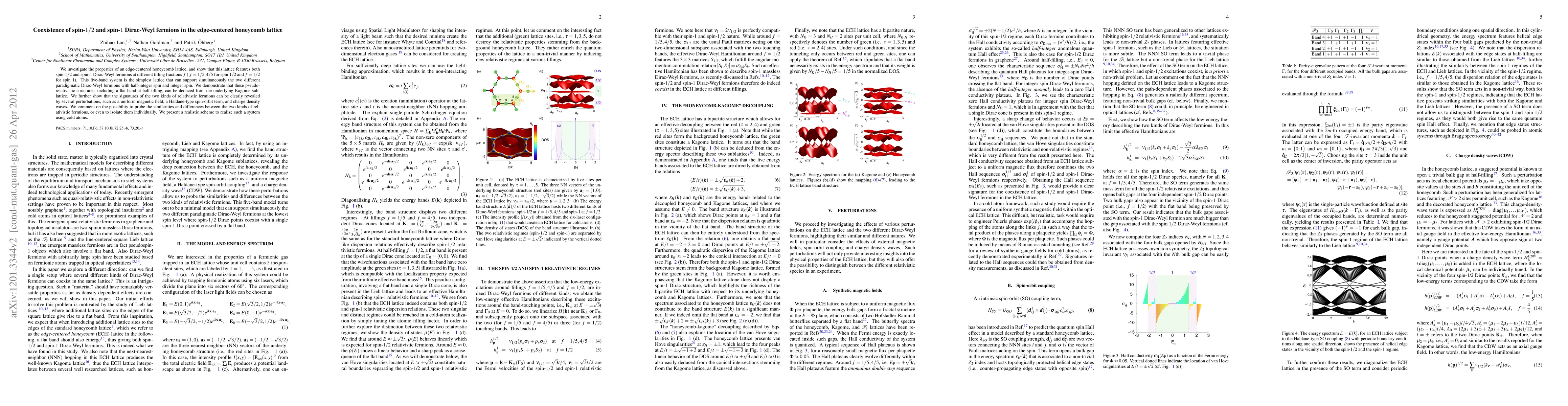 This paper explores an edge-centered honeycomb lattice that supports both spin-1/2 and spin-1 Dirac-Weyl fermions at different filling fractions, revealing pseudo-relativistic structures and potential for experimental realization using cold atoms. Signatures of these fermions can be highlighted by various perturbations, offering insights into their unique properties.