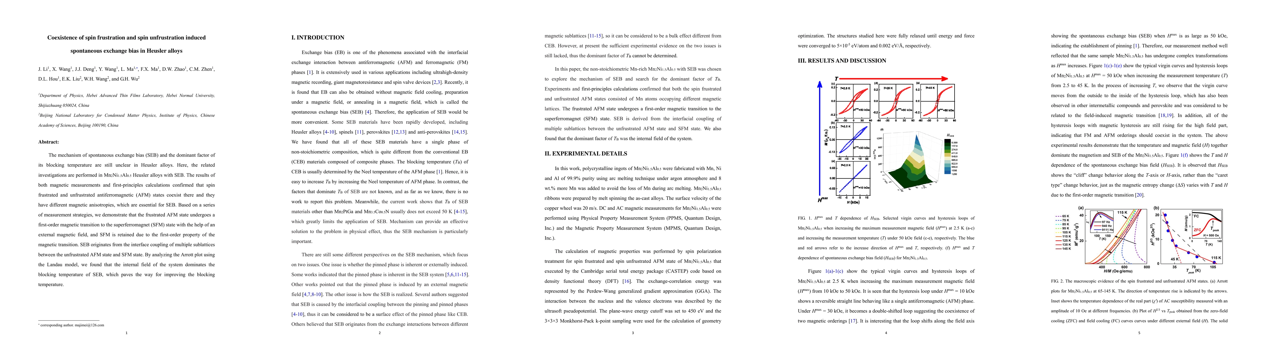 The mechanism of spontaneous exchange bias (SEB) and the dominant factor of its blocking temperature are still unclear in Heusler alloys. Here, the related investigations are performed in Mn2Ni1.5Al0.5 Heusler alloys with SEB. The results of both magnetic measurements and first-principles calculations confirmed that spin frustrated and unfrustrated antiferromagnetic (AFM) states coexist there and they have different magnetic anisotropies, which are essential for SEB. Based on a series of measurement strategies, we demonstrate that the frustrated AFM state undergoes a first-order magnetic transition to the superferromagnet (SFM) state with the help of an external magnetic field, and SFM is retained due to the first-order property of the magnetic transition. SEB originates from the interface coupling of multiple sublattices between the unfrustrated AFM state and SFM state. By analyzing the Arrott plot using the Landau model, we found that the internal field of the system dominates the blocking temperature of SEB, which paves the way for improving the blocking temperature.