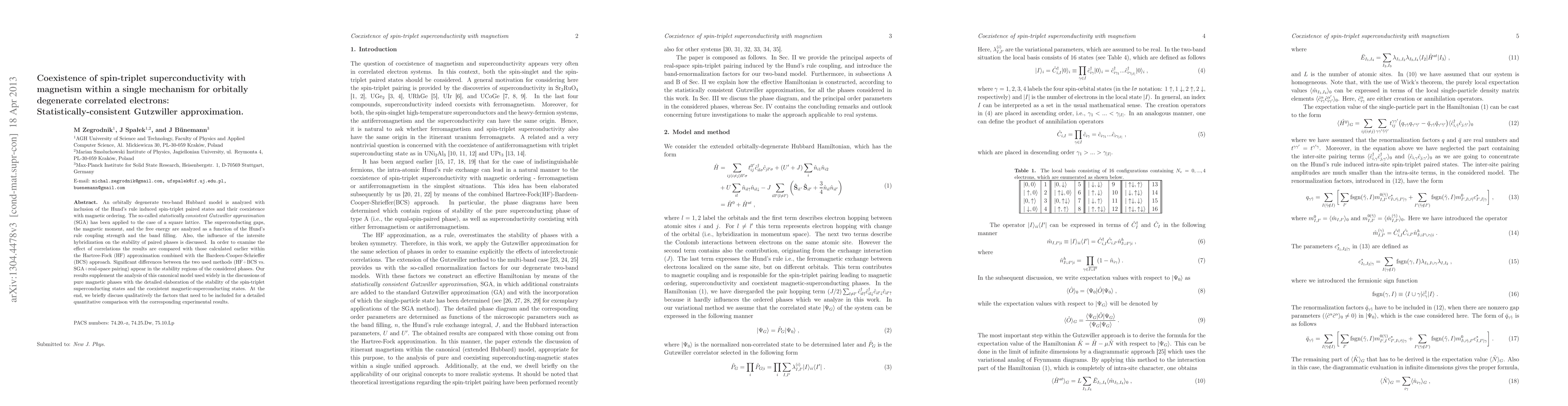 An orbitally degenerate two-band Hubbard model is analyzed with inclusion of the Hund's rule induced spin-triplet paired states and their coexistence with magnetic ordering. The so-called statistically consistent Gutzwiller approximation (SGA) has been applied to the case of a square lattice. The superconducting gaps, the magnetic moment, and the free energy are analyzed as a function of the Hund's rule coupling strength and the band filling. Also, the influence of the intersite hybridization on the stability of paired phases is discussed. In order to examine the effect of correlations the results are compared with those calculated earlier within the Hartree-Fock (HF) approximation combined with the Bardeen-Cooper-Schrieffer (BCS) approach. Significant differences between the two used methods (HF+BCS vs. SGA+real-space pairing) appear in the stability regions of the considered phases. Our results supplement the analysis of this canonical model used widely in the discussions of pure magnetic phases with the detailed elaboration of the stability of the spin-triplet superconducting states and the coexistent magnetic-superconducting states. At the end, we briefly discuss qualitatively the factors that need to be included for a detailed quantitative comparison with the corresponding experimental results.