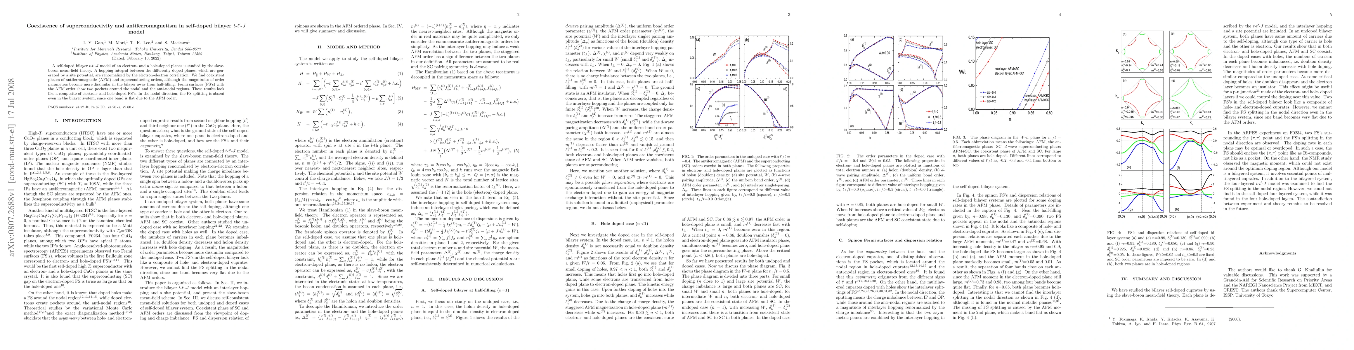 A self-doped bilayer t-t'-J model of an electron- and a hole-doped planes is studied by the slave-boson mean-field theory. A hopping integral between the differently doped planes, which are generated by a site potential, are renormalized by the electron-electron correlation. We find coexistent phases of antiferromagnetic (AFM) and superconducting orders, although the magnitudes of order parameters become more dissimilar in the bilayer away from half-filling. Fermi surfaces (FS's) with the AFM order show two pockets around the nodal and the anti-nodal regions. These results look like a composite of electron- and hole-doped FS's. In the nodal direction, the FS splitting is absent even in the bilayer system, since one band is flat due to the AFM order.