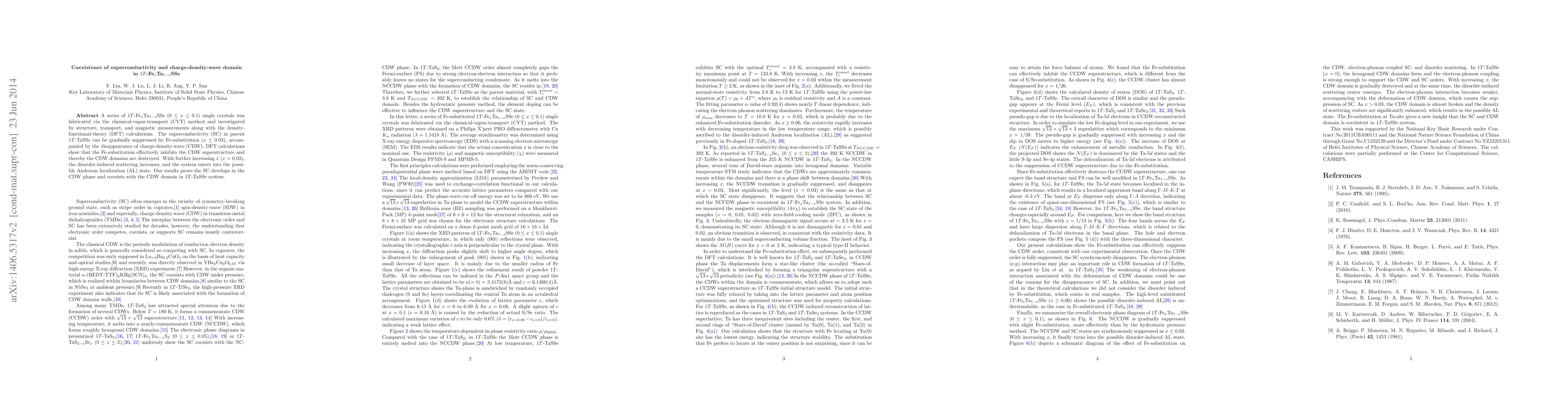 A series of $1T$-Fe$_x$Ta$_{1-x}$SSe (0 $\leq x \leq$ 0.1) single crystals was fabricated via the chemical-vapor-transport (CVT) method and investigated by structure, transport, and magnetic measurements along with the density-functional-theory (DFT) calculations. The superconductivity (SC) in parent $1T$-TaSSe can be gradually suppressed by Fe-substitution ($x\leq0.03$), accompanied by the disappearance of charge-density-wave (CDW). DFT calculations show that the Fe-substitution effectively inhibits the CDW superstructure and thereby the CDW domains are destroyed. With further increasing $x$ ($x>0.03$), the disorder-induced scattering increases, and the system enters into the possible Anderson localization (AL) state. Our results prove the SC develops in the CDW phase and coexists with the CDW domain in $1T$-TaSSe system.