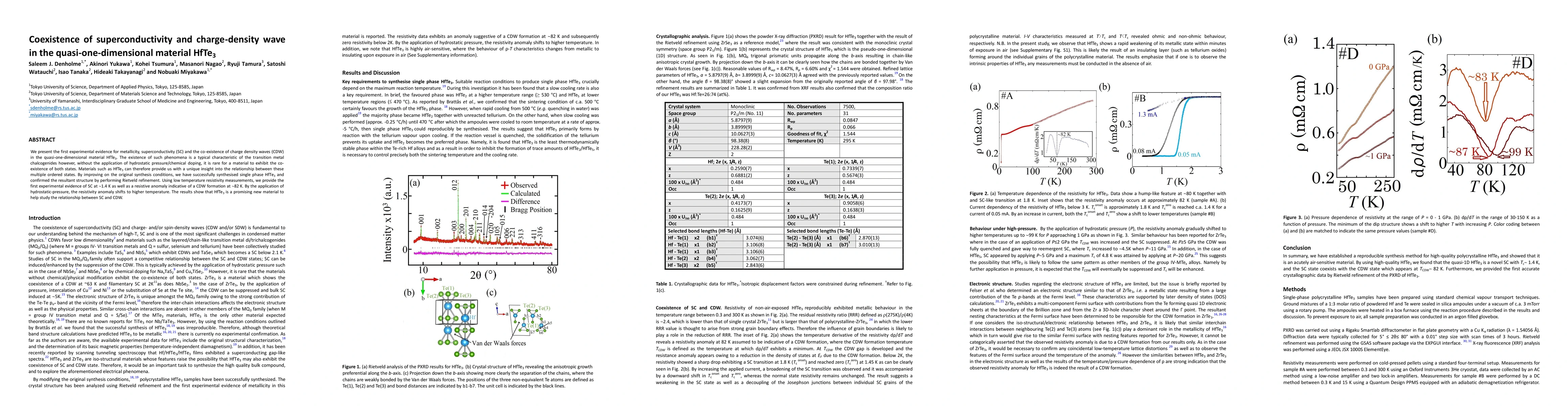 We present the first experimental evidence for metallicity, superconductivity (SC) and the co-existence of charge density waves (CDW) in the quasi-one-dimensional material HfTe3. The existence of such phenomena is a typical characteristic of the transition metal chalcogenides however, without the application of hydrostatic pressure/chemical doping, it is rare for a material to exhibit the co-existence of both states. Materials such as HfTe3 can therefore provide us with a unique insight into the relationship between these multiple ordered states. By improving on the original synthesis conditions, we have successfully synthesised single phase HfTe3 and confirmed the resultant structure by performing Rietveld refinement. Using low temperature resistivity measurements, we provide the first experimental evidence of SC at ~1.4 K as well as a resistive anomaly indicative of a CDW formation at ~82 K. By the application of hydrostatic-pressure, the resistivity anomaly shifts to higher temperature. The results show that HfTe3 is a promising new material to help study the relationship between SC and CDW.
