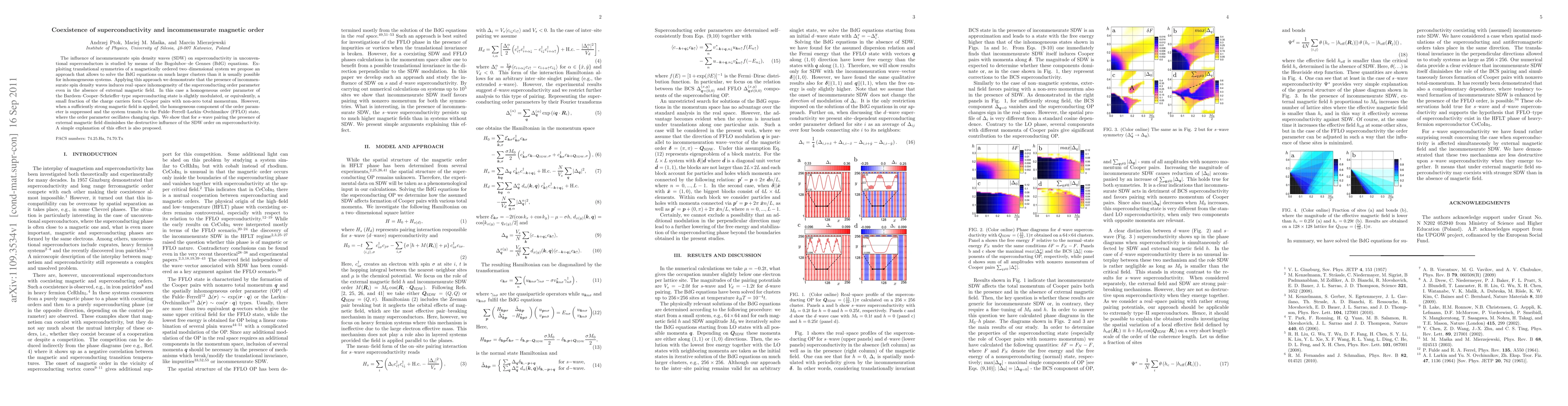 The influence of incommensurate spin density waves (SDW) on superconductivity in unconventional superconductors is studied by means of the Bogolubov-de Gennes (BdG) equations. Exploiting translational symmetries of a magnetically ordered two-dimensional system we propose an approach that allows to solve the BdG equations on much larger clusters than it is usually possible for inhomogeneous systems. Applying this approach we demonstrate that the presence of incommensurate spin density waves induces real-space inhomogeneity of the superconducting order parameter even in the absence of external magnetic field. In this case a homogeneous order parameter of the Bardeen-Cooper-Schrieffer-type superconducting state is slightly modulated, or equivalently, a small fraction of the charge carriers form Cooper pairs with non-zero total momentum. However, when a sufficiently strong magnetic field is applied, the homogeneous component of the order parameter is suppressed and the system transits to the Fulde-Ferrell-Larkin-Ovchinnikov (FFLO) state, where the order parameter oscillates changing sign. We show that for s-wave pairing the presence of external magnetic field diminishes the destructive influence of the SDW order on superconductivity. A simple explanation of this effect is also proposed.