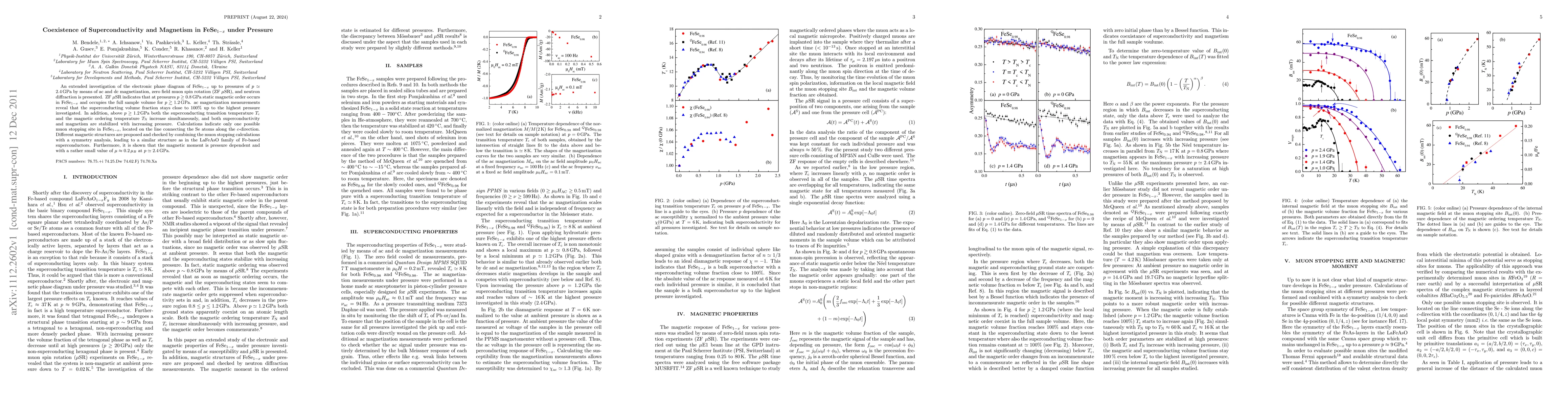 Researchers investigated FeSe_1-x under pressure, finding that superconductivity and magnetism coexist with increasing pressure, with the magnetic moment decreasing as it reaches its lowest value at 0.2 ε_B.
