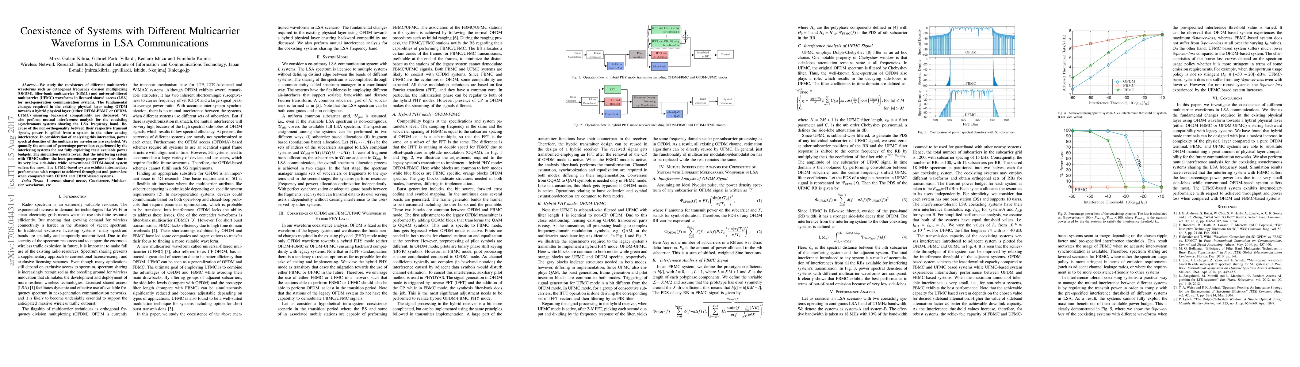This paper investigates the coexistence of various multicarrier waveforms—OFDM, FBMC, and UFMC—in licensed shared access (LSA) for next-gen communication systems. The study highlights the necessary modifications to existing physical layers to ensure backward compatibility and analyzes mutual interference among asynchronous systems, revealing that FBMC experiences the least power loss due to its low side-lobes, while OFDM suffers the most.