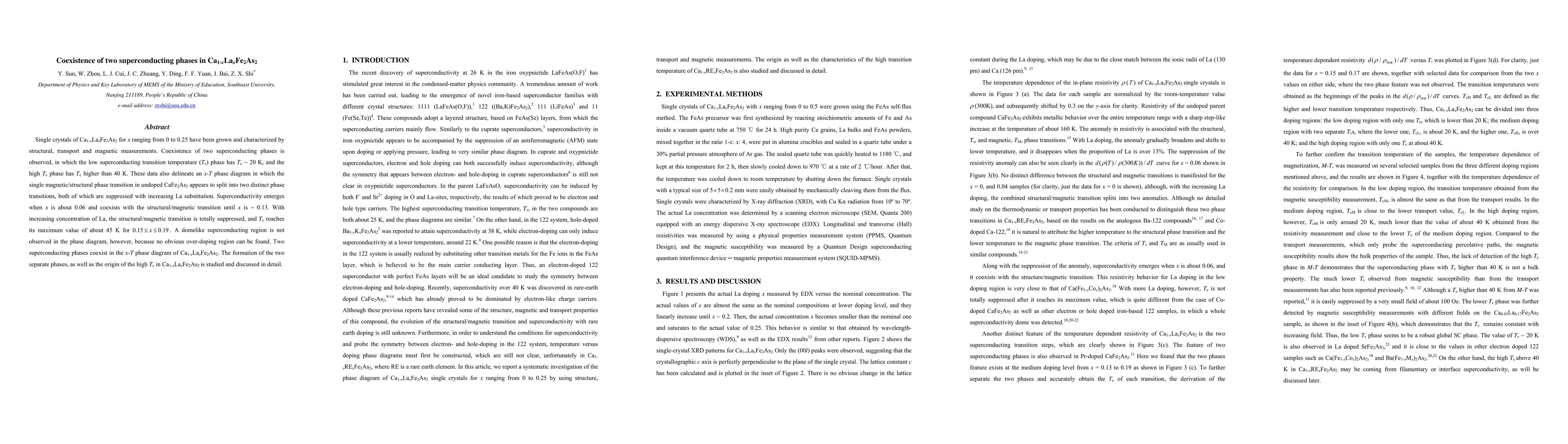 Single crystals of Ca1-xLaxFe2As2 for x ranging from 0 to 0.25 have been grown and characterized by structural, transport and magnetic measurements. Coexistence of two superconducting phases is observed, in which the low superconducting transition temperature (Tc) phase has Tc ~ 20 K, and the high Tc phase has Tc higher than 40 K. These data also delineate an x - T phase diagram in which the single magnetic/structural phase transition in undoped CaFe2As2 appears to split into two distinct phase transitions, both of which are suppressed with increasing La substitution. Superconductivity emerges when x is about 0.06 and coexists with the structural/magnetic transition until x is ~ 0.13. With increasing concentration of La, the structural/magnetic transition is totally suppressed, and Tc reaches its maximum value of about 45 K for 0.15 < x < 0.19. A domelike superconducting region is not observed in the phase diagram, however, because no obvious over-doping region can be found. Two superconducting phases coexist in the x - T phase diagram of Ca1-xLaxFe2As2. The formation of the two separate phases, as well as the origin of the high Tc in Ca1-xLaxFe2As2 is studied and discussed in detail.