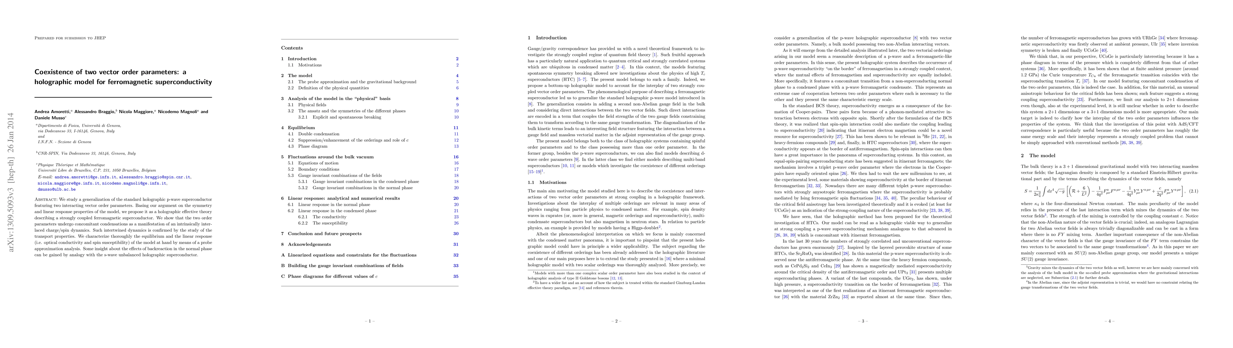 We study a generalization of the standard holographic p-wave superconductor featuring two interacting vector order parameters. Basing our argument on the symmetry and linear response properties of the model, we propose it as a holographic effective theory describing a strongly coupled ferromagnetic superconductor. We show that the two order parameters undergo concomitant condensations as a manifestation of an intrinsically interlaced electric/magnetic dynamics. Such intertwined dynamics is confirmed by the study of the transport properties. We characterize thoroughly the equilibrium and the linear response (i.e. optical conductivity and magnetic susceptibility) of the model at hand by means of a probe approximation analysis. Some insight about the effects of backreaction in the normal phase can be gained by analogy with the s-wave unbalanced holographic superconductor.