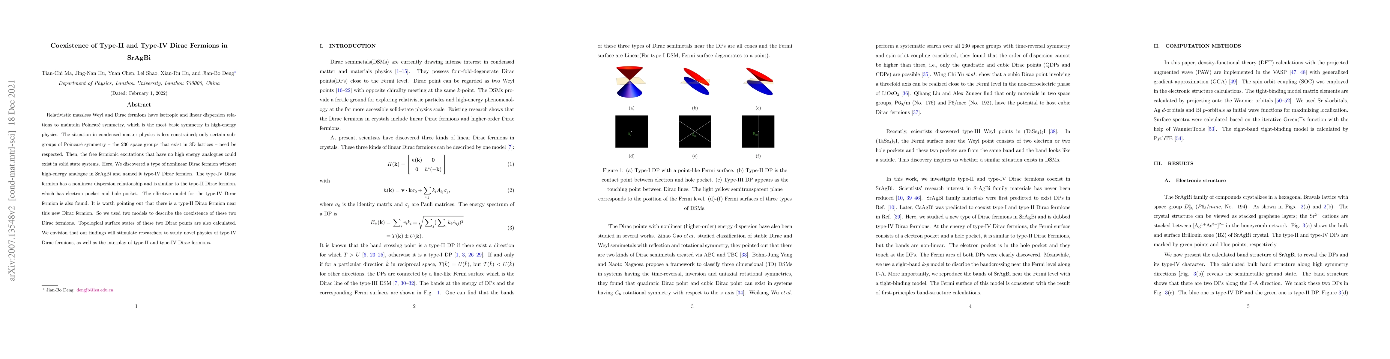 SrAgBi hosts both type-II and type-IV Dirac fermions, characterized by nonlinear and linear dispersion relationships, respectively, alongside their topological surface states. This coexistence provides a novel platform for studying unique condensed matter physics phenomena.