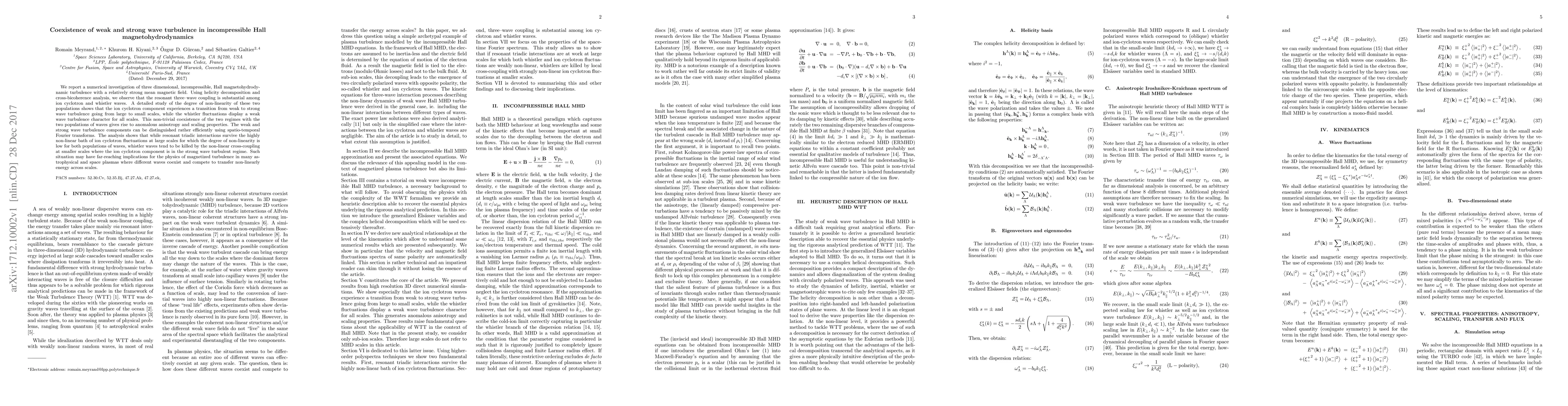 This paper investigates the coexistence of weak and strong wave turbulence in three-dimensional, incompressible Hall magnetohydrodynamics, revealing that ion cyclotron waves transition from weak to strong turbulence while whistler waves remain weakly turbulent. This dual regime leads to anomalous anisotropy and scaling properties.