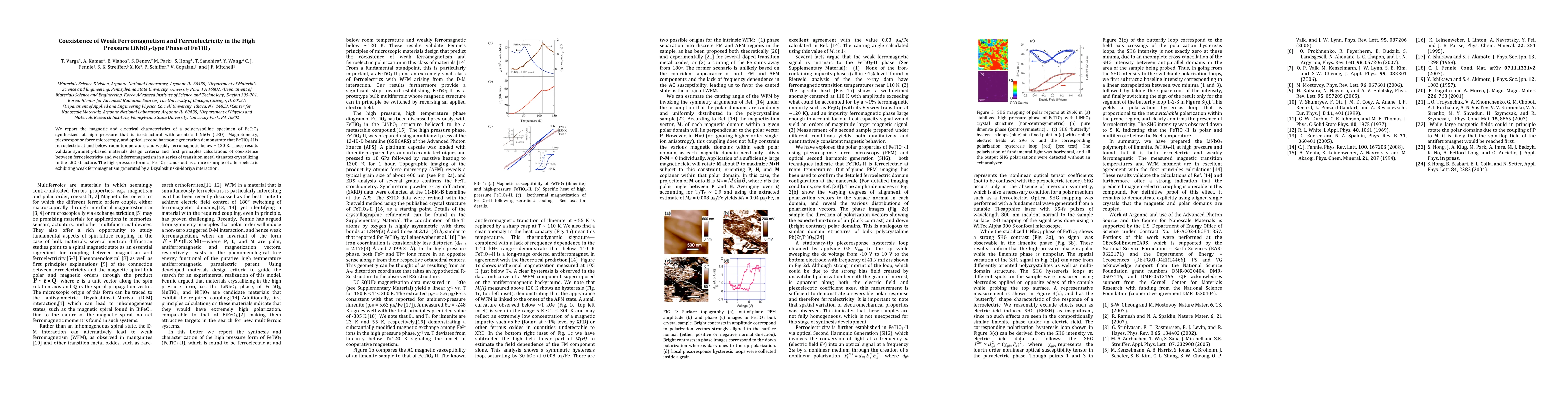 This study reveals that high-pressure FeTiO3 exhibits both ferroelectricity and weak ferromagnetism, validated by piezoresponse force microscopy and magnetometry. This coexistence supports theoretical predictions and highlights FeTiO3 as a rare material with weak ferromagnetism driven by Dzyaloshinskii-Moriya interaction.