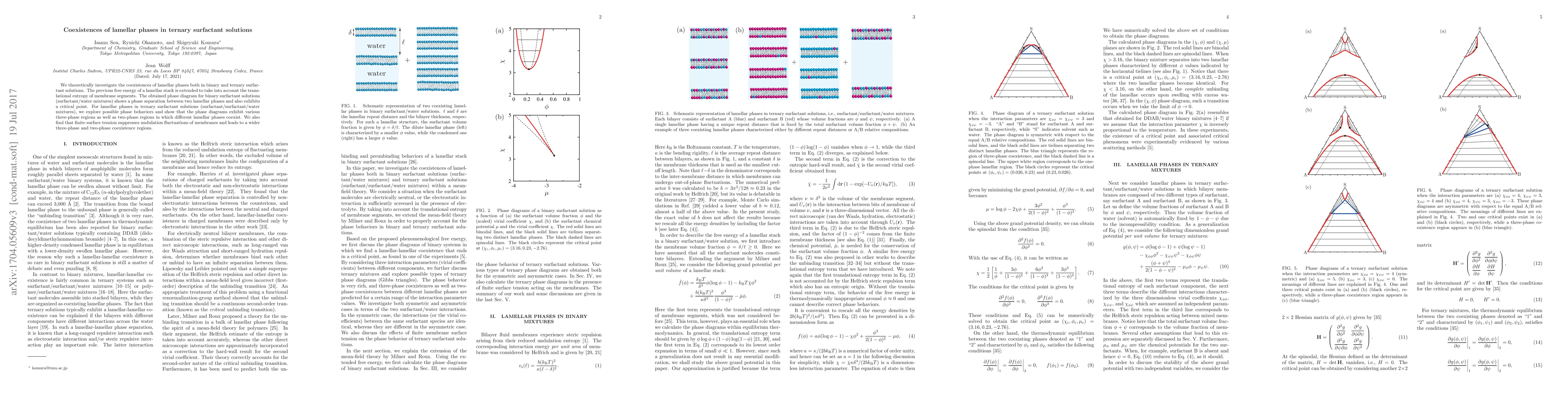 This paper theoretically investigates the coexistence of lamellar phases in both binary and ternary surfactant solutions, extending the free energy model to include membrane entropy. It reveals phase separations and critical points in binary mixtures and diverse phase behaviors, including three-phase and two-phase regions, in ternary mixtures, with surface tension influencing membrane stability.