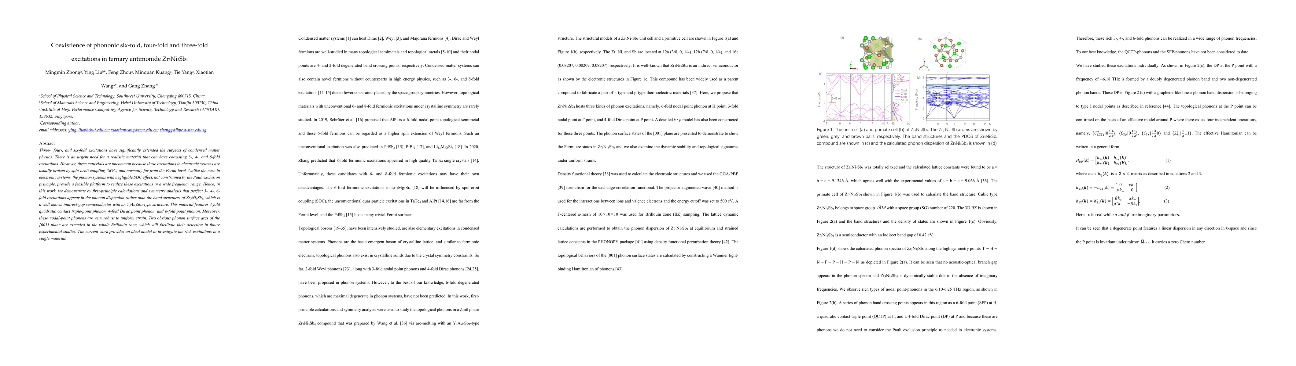 Three-, four-, and six-fold excitations have significantly extended the subjects of condensed matter physics. There is an urgent need for a realistic material that can have coexisting 3-, 4-, and 6-fold excitations. However, these materials are uncommon because these excitations in electronic systems are usually broken by spin-orbit coupling (SOC) and normally far from the Fermi level. Unlike the case in electronic systems, the phonon systems with negligible SOC effect, not constrained by the Pauli exclusion principle, provide a feasible platform to realize these excitations in a wide frequency range. Hence, in this work, we demonstrate by first-principle calculations and symmetry analysis that perfect 3-, 4-, 6-fold excitations appear in the phonon dispersion rather than the band structures of Zr3Ni3Sb4, which is a well-known indirect-gap semiconductor with an Y3Au3Sb4-type structure. This material features 3-fold quadratic contact triple-point phonon, 4-fold Dirac point phonon, and 6-fold point phonon. Moreover, these nodal-point phonons are very robust to uniform strain. Two obvious phonon surface arcs of the [001] plane are extended in the whole Brillouin zone, which will facilitate their detection in future experimental studies. The current work provides an ideal model to investigate the rich excitations in a single material.