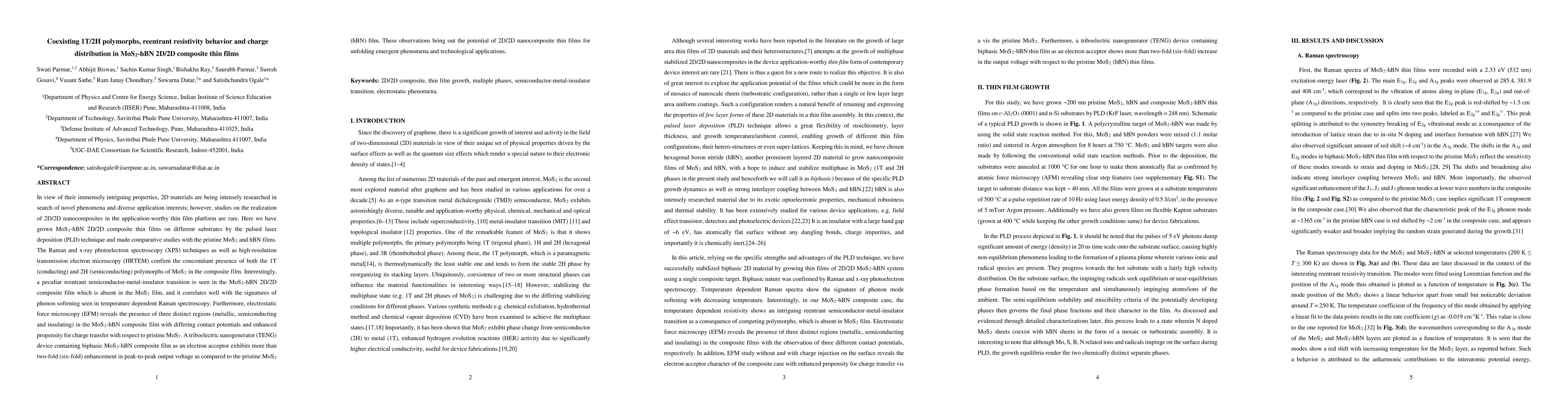 In view of their immensely intriguing properties, two dimensional materials are being intensely researched in search of novel phenomena and diverse application interests, however, studies on the realization of nanocomposites in the application-worthy thin-film platform are rare. Here we have grown MoS2-hBN composite thin films on different substrates by the pulsed laser deposition technique and made comparative studies with the pristine MoS2 and hBN films. The Raman, XPS and HRTEM confirm the concomitant presence of both the 1T (conducting) and 2H (semiconducting) polymorphs of MoS2 in the composite film. Interestingly, a peculiar reentrant semiconductor-metal-insulator transition is seen in the composite film which is absent in the MoS2 film, and it correlates well with the signatures of phonon softening seen in temperature-dependent Raman spectroscopy. Furthermore, electrostatic force microscopy reveals the presence of three distinct regions (metallic, semiconducting, and insulating) in the composite film with differing contact potentials and enhanced propensity for charge transfer with respect to pristine MoS2. A triboelectric nanogenerator device containing biphasic composite film as an electron acceptor exhibits more than twofold (sixfold) enhancement in peak-to-peak output voltage as compared to the pristine MoS2 (hBN) film. These observations bring out the potential of nanocomposite thin films for unfolding emergent phenomena and technological applications.