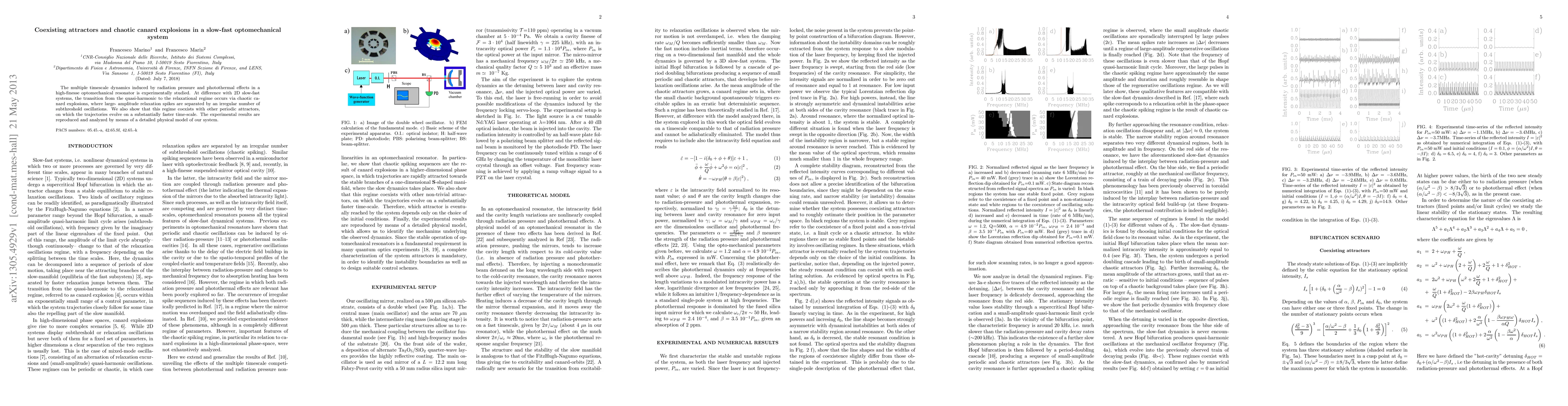 This paper investigates the complex dynamics in a high-finesse optomechanical resonator, revealing chaotic canard explosions leading to large-amplitude spikes amidst subthreshold oscillations. Coexisting attractors are observed, with the system transitioning between different regimes on varying time scales, all modeled and analyzed through a detailed physical framework.