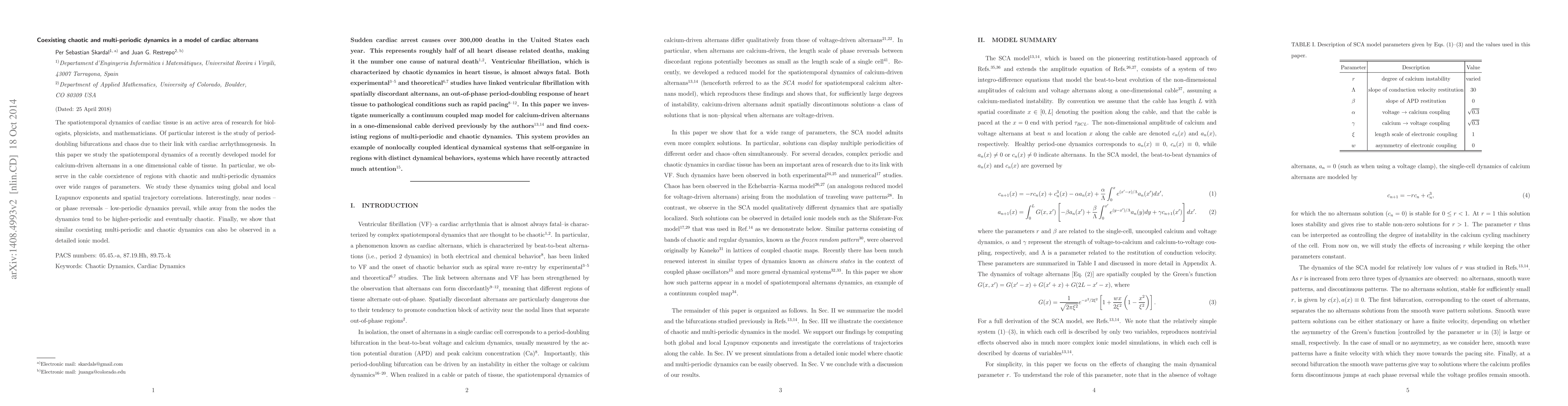 The spatiotemporal dynamics of cardiac tissue is an active area of research for biologists, physicists, and mathematicians. Of particular interest is the study of period-doubling bifurcations and chaos due to their link with cardiac arrhythmogenesis. In this paper we study the spatiotemporal dynamics of a recently developed model for calcium-driven alternans in a one dimensional cable of tissue. In particular, we observe in the cable coexistence of regions with chaotic and multi-periodic dynamics over wide ranges of parameters. We study these dynamics using global and local Lyapunov exponents and spatial trajectory correlations. Interestingly, near nodes -- or phase reversals -- low-periodic dynamics prevail, while away from the nodes the dynamics tend to be higher-periodic and eventually chaotic. Finally, we show that similar coexisting multi-periodic and chaotic dynamics can also be observed in a detailed ionic model.