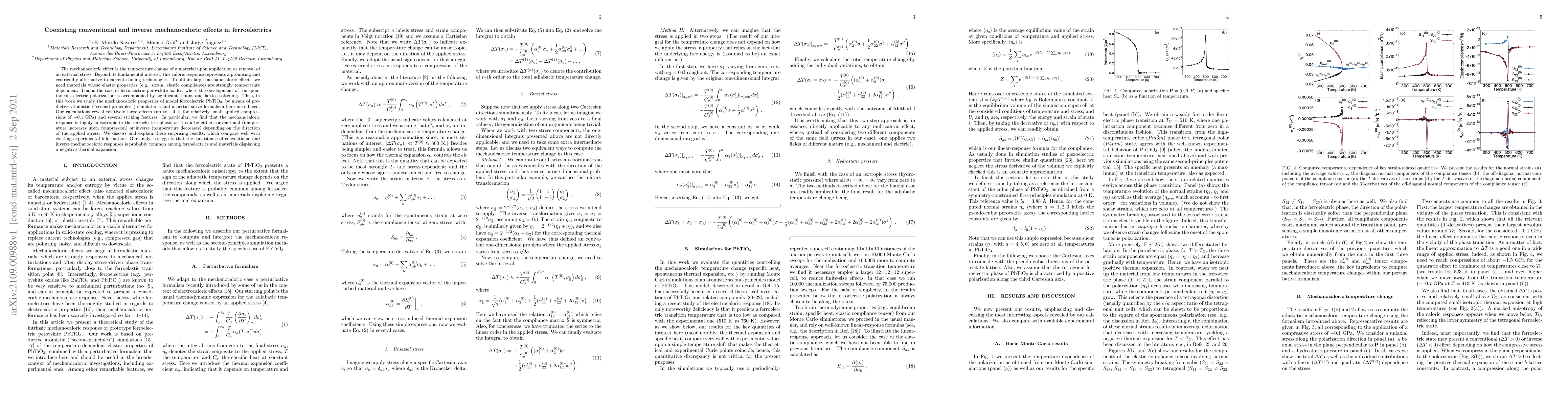 This paper investigates the mechanocaloric effects in ferroelectric PbTiO$_3$, revealing significant temperature changes under stress due to its temperature-dependent elastic properties. The study finds that the mechanocaloric response is highly anisotropic, exhibiting both conventional and inverse effects depending on the direction of applied stress, suggesting this coexistence is likely common among ferroelectric materials.