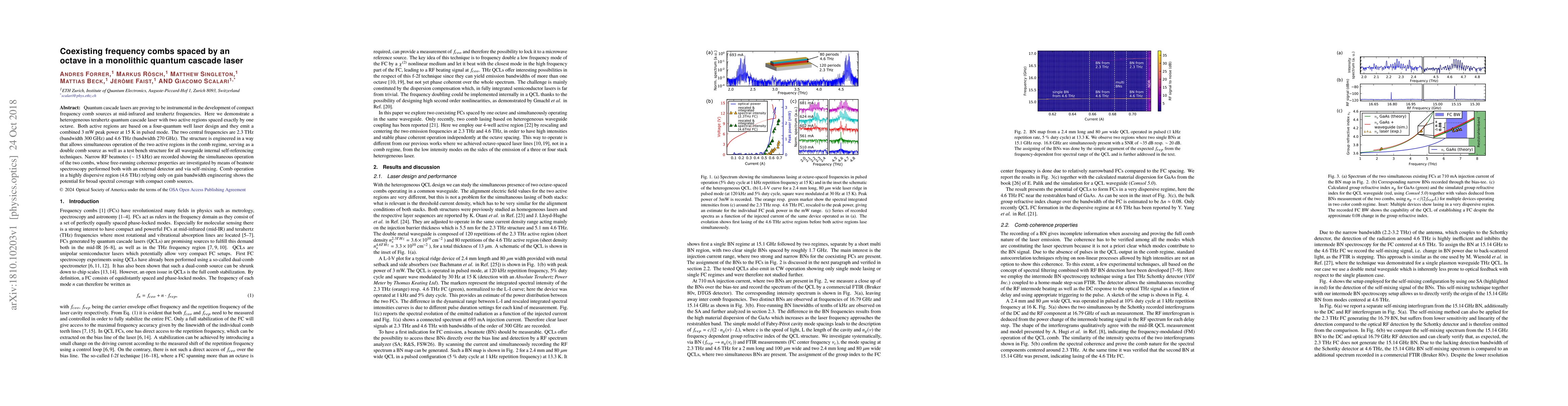 This paper demonstrates a monolithic quantum cascade laser featuring two active regions spaced by an octave, generating coexisting terahertz frequency combs at 2.3 THz and 4.6 THz. The design enables a combined peak power of 3 mW and showcases potential for compact, broad spectral coverage frequency comb sources.
